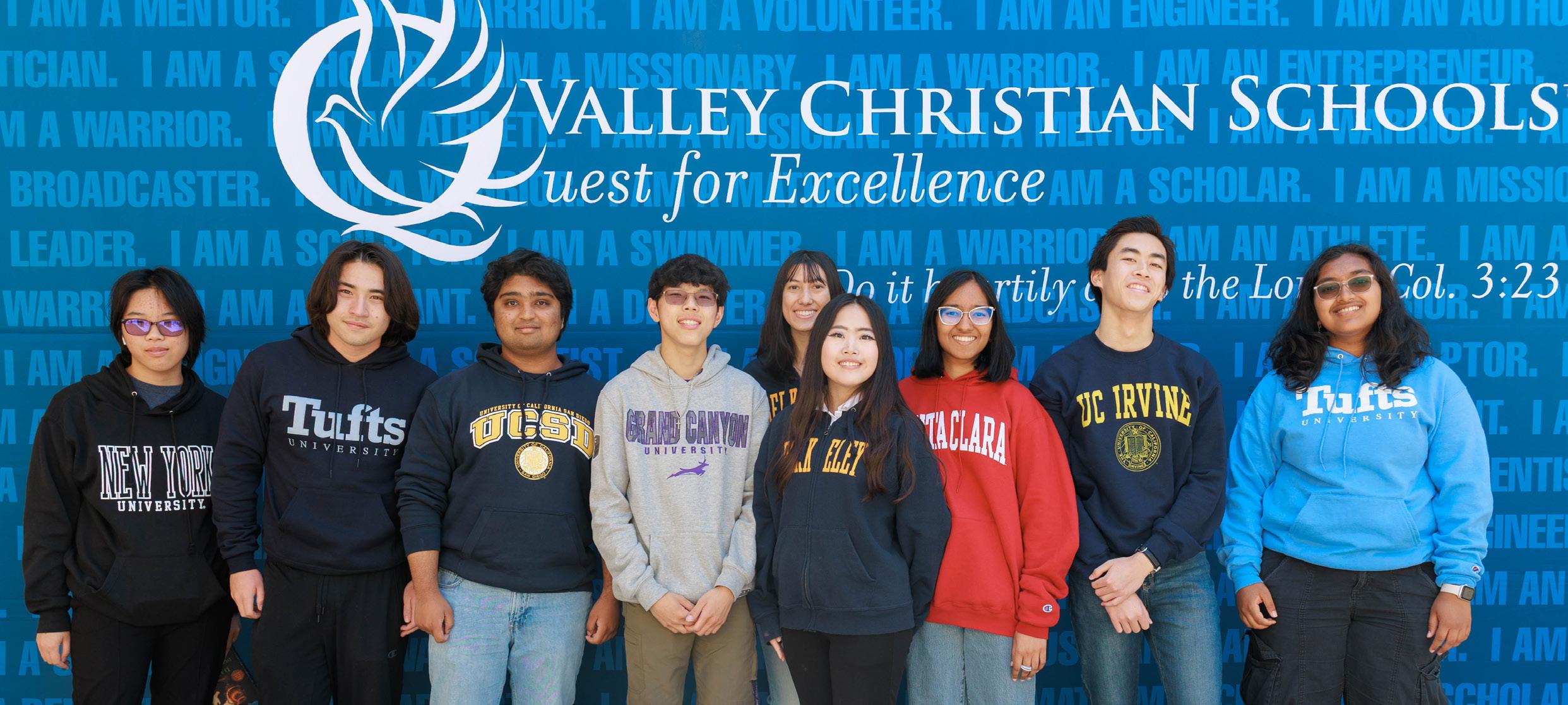 Valley Christian Schools supports the homes and churches of students in providing an education that is grounded in the Judeo-Christian values of the Bible, as reflected in the life and teaching of Jesus Christ. Valley Christian Schools is committed to a Quest for Excellence™ in all of its educational programs, and provides a comprehensive kindergarten through twelfth grade curriculum with a rigorous college preparatory program. Firmly founded on Christian values, Valley Christian Schools challenges youth to aspire toward lives of character, service, and influence while pursuing their individual Quests for Excellence