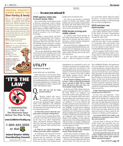 EVSD decides to bring back middle schools At a March school board meeting, the East Valley School Board voted to discontinue its K-8 structure and move back to elementary schools housing kindergarten through sixth grade students. The board had been weighing the decision and requesting feedback from the community since the beginning of the year. In March the group voted 4 to 1 in favor of the switch, which will take effect for the 20142015 school year. In 2011, East Valley closed its middle schools — with the exception of Continumanagement are committed to serve our customers in the best way possible and respond to input from our customers. This and making decisions for the long term instead of a short-term gain has positioned Modern to continue to provide excellent and reliable customer service with the lowest rates in the region and state. Q: The Modern building on Pines has become a Valley architectural landmark since it opened in 2000. Tell us a little about the process that went into constructing this unique building. A: By the mid 1990s, Modern had outgrown its headquarters that was built in the 1950s. When I say “outgrown,” not only in the need for more space but to better serve our customers with a more inviting atmosphere and conveniences such as a drive-up window and a work area for our employees to be more efficient and provide a pleasant work environment. After getting approval from the board for a new building, we interviewed architects and hired the architect that we thought would best carry out the goal of an energyefficient building that was sustainable and would be a pleasant environment for both our employees and customers. For the design of the building, we had employee representatives from all departments work with the architect to design a building that worked best for each department, customers and employees’ needs. Q: Modern has a unique reputation for being locally-owned and consumer owned. Where did this start? A: The three founders of Modern Electric Water Company were brilliant and visionaries in the formation of the company — the basic structure still works and is very efficient today. Over 100 years ago when