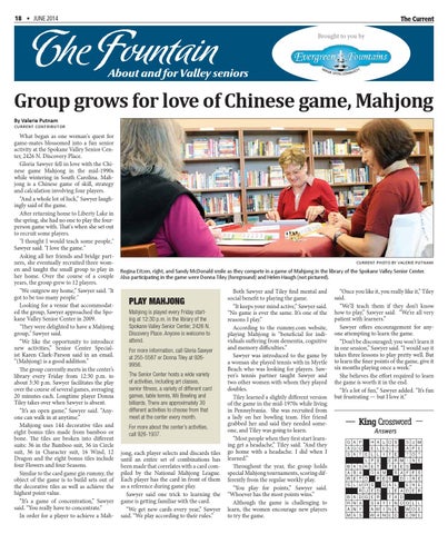 PLAY MAHJONG Mahjong is played every Friday starting at 12:30 p.m. in the library of the Spokane Valley Senior Center, 2426 N. Discovery Place. Anyone is welcome to attend. For more information, call Gloria Sawyer at 255-5587 or Donna Tiley at 9269956. The Senior Center hosts a wide variety of activities, including art classes, senior fitness, a variety of different card games, table tennis, Wii Bowling and billiards. There are approximately 30 different activities to choose from that meet at the center every month. For more about the center’s activities, call 926-1937. jong, each player selects and discards tiles until an entire set of combinations has been made that correlates with a card compiled by the National Mahjong League. Each player has the card in front of them as a reference during game play. Sawyer said one trick to learning the game is getting familiar with the card. “We get new cards every year,” Sawyer said. “We play according to their rules.”