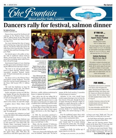 The Spokane area Council is comprised of 25 dance clubs throughout the region. Dancing lessons begin in late September/October. Each lesson costs $5. Classes are offered at the Western Dance Center, 1901 N. Sullivan Road, or the North Spokane Dance Center, 7424 N. Freya St. A variety of dancing is done at the Hall including square and round dancing, clogging and line dancing. For more information, call 979-2607 or visit www.squaredancespokane.org. as long as you want," Bailly said. "You can put as much or as little into it you want." For both Mann and Snyder, square dancing has been a big part of their lives. Mann met her dancing partner Roger Olson on the dance floor 12 years ago, and have been dancing together ever since. "It's where you meet your friends," Mann said, who dances three to four times a week with the Valley Crosstrainers. "We can't say