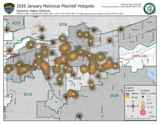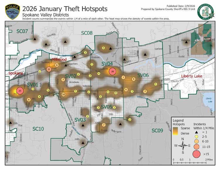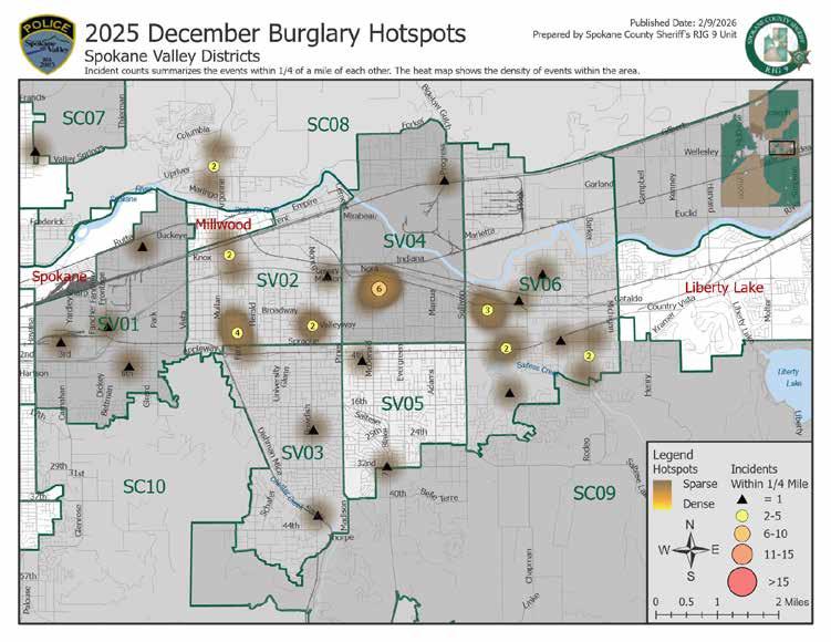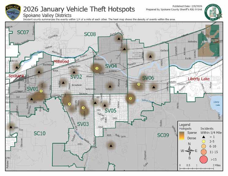 The maps provided depict where citizens have reported Vehicle Thefts, Burglaries, Malicious Mischief and Thefts. The Spokane Valley Police Department and the Spokane County Sheriff’s office analyze this data to determine high crime areas and where to allocate resources. Citizens who have been a victim of crime are encouraged to call 911, if the crime is in progress, or Crime Check at 4562233, if not in progress, to report a crime.