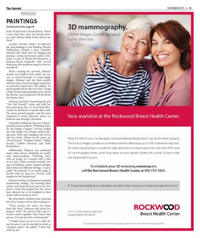 beds. I’d pick them. I’d smell them. When I was a kid, they were my favorite flowers, and I always think of her when I see them.” Another favorite subject of Johnson’s life and paintings is her bulldog, Phoebe Wilhelmina. Despite a busy schedule, Johnson also finds time for singing and playing a string instrument called a dulcimer as part of Micah 6:8 Ministries, a Spokane-based nonprofit with several musicians who perform songs for the terminally ill. When creating her artwork, Johnson mainly uses bright acrylic paints on canvas, or colored pencils, to create happy images. Johnson said she hears people will buy a piece based on happy memories or personal connections. She added, “So many people tell me they love this ‘Tough Chick’ because their grandma was a Rosie the Riveter, and I painted it off the Rosie the Riveter idea.” Johnson currently is launching the new “The Girl Friends” series and held her first artist show Nov. 13-14 at Hurd Mercantile in Rockford to unveil that work. The show proved popular, and the store requested to keep Johnson’s pieces on hand for sale through Christmas. Currently totaling six, the new coloredpenciled series includes “Whistling Wanda The Happy Camper,” red hair pulled up, with images of a vintage camper, fishing pole, book and camping cup woven into her locks. Others in the series are “Proud Penny,” “Frankie’s Fetish,” “Stella’s Escape,” “Gabby’s Moment,” and “Belle Remembers.” Additionally, Johnson has produced many other pieces, including an acrylic and mixed-medium “Watering Day,” with an image of a woman with a bird in her hair. Other artwork includes images of bulldogs, nature-inspired designs and women in different settings. A piece called “Be Yourself ” is an artful image of herself with her dog on a bicycle, with poppies in the background. Johnson said her art business is gaining momentum, adding, “I’m meeting other artists, and I hope by next year to do a few shows. I feel encouraged that the stores have allowed me to be included in their shops with me being so new.” She described a balance from enjoying her job as hospice nurse and creating art. “Every person you meet, you learn their life story,” Johnson said about her hospice work. “It’s end of a life, and everyone comes together. They honor that person. I’ve just met the coolest people.” “I totally know my art is an outlet for me because it can be stressful to work as a hospice nurse,” she added. “I have fun with my art.”