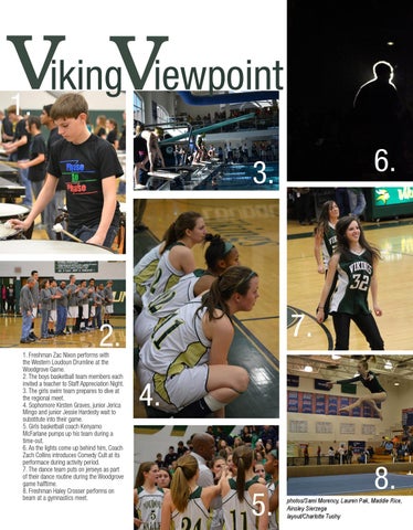 1. Freshman Zac Nixon performs with the Western Loudoun Drumline at the Woodgrove Game. 2. The boys basketball team members each invited a teacher to Staff Appreciation Night. 3. The girls swim team prepares to dive at the regional meet. 4. Sophomore Kirsten Graves, junior Jerica Mingo and junior Jessie Hardesty wait to substitute into their game. 5. Girls basketball coach Kenyamo McFarlane pumps up his team during a time-out. 6. As the lights come up behind him, Coach Zach Collins introduces Comedy Cult at its performace during activity period. 7. The dance team puts on jerseys as part of their dance routine during the Woodgrove game halftime. 8. Freshman Haley Crosser performs on beam at a gymnastics meet.