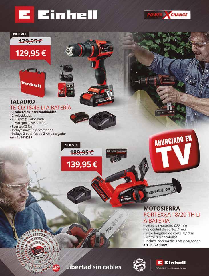 feliz navidad - bon nadal - eguberri on - bo nadal - feliz navidad - 70 1 1 2 2 3 3 TALADRO ATORNILLADOR 10,8 V BDCDD12HTSA BLACK & DECKER Incluye una batería 1,5 Ah de litio, 6 herramientas manuales, 14 accesorios y bolsa de herramientas. 84,95 € Ref. 112.745 TALADRO PERCUTOR SIN CABLE TE-CD 18/2 LI-I + 22 EINHELL 18 V. 2500 mAh . Li-Ion. Número de marchas: 2. Velocidad de ralentí (marcha 1) 0-350 min ^ -1. Velocidad de ralentí (marcha 2) 0-1250 min ^ -1. Max. par de torsión fuerte 44 Nm. Número de pasos de par 20 ajustes. Portabrocas 13 mm. 119,00 € Ref. 112.183 TALADROS A BATERÍA TALADRO A BATERÍA TE-CD 18/2 LI EINHELL Número de velocidades 2 Velocidad í (marcha 1) 0-350 min ^ -1 Velocidad (marcha 2) 0-1250 min ^ -1 Max. par fuerza 44 Nm Número de par de aprietes 21 ajustes Portabrocas 10 mm. Automático 49,95 € Ref. 112.186 TALADRO PERCUTOR 710W. BEH710K-QS BLACK & DECKER Incluye 4 brocas, empuñadura lateral y maletín. 52,95 € Ref. 112.752 TALADRO UNIVERSAL IMPACT 700 + 15 PCS X-LINE BOSCH Atornillador y taladrador con potente motor de 700 W incluso en hormigón. Fácil de usar debido a su diseño compacto y ligero para un mayor control y manejo. Preselección de velocidades para usuarios DIY más exigentes y electrónica constante. Empuñadura adicional, tope de profundidad, regalo set x line y maletín. 99,95 € Ref. 112.656 TALADRO PERCUTOR TE-ID 750/1 E EINHELL 750 W. RPM 0-3000. Impactos (min) 48000. Portabrocas 13 mm. Porta brocas metálico rápido, Sistema de Aspiración de polvo asistido, Carcasa frontal metálica, Regulación de velocidades electrónica, tope de pro fundidad metálico. 30 mm madera / 12 mm hormigón / 14 mm acero. 64,95 € Ref. 112.190 TALADROS ELÉCTRICOS
