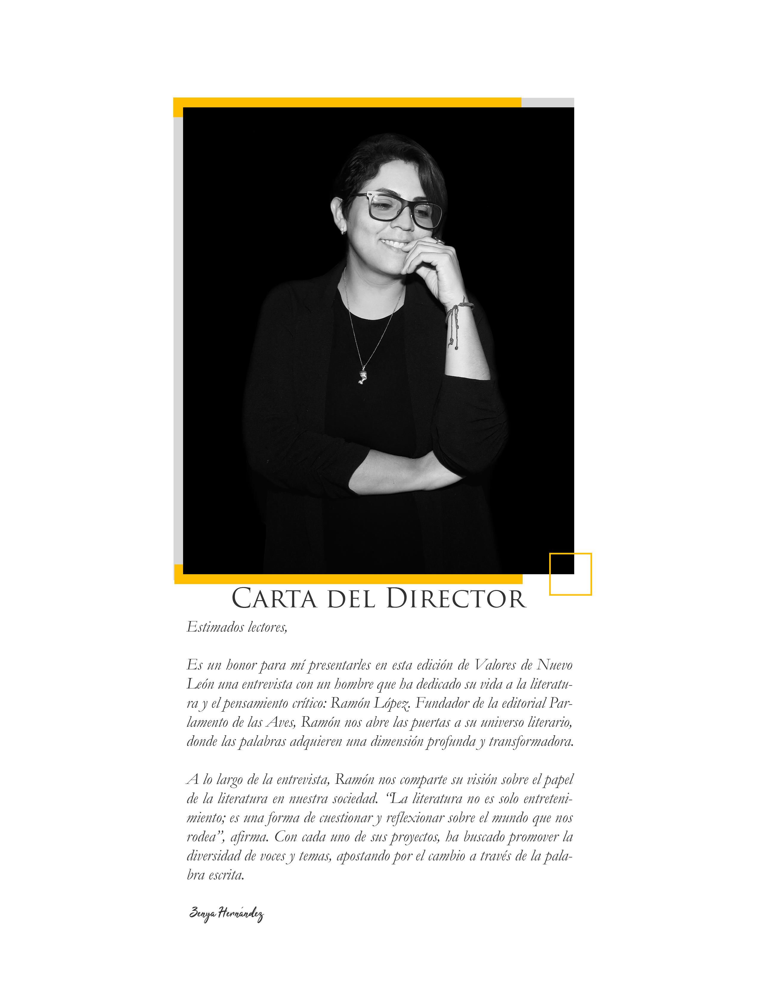 Valores de Nuevo León, revista mensual #145 Agosto 2024. Editor Responsable: Zenyazhent Martha Esperanza Hernández Valladares. Número de Certificado de Reserva otorgado por el Instituto Nacional del Derecho de Autor: 04 - 2016 - 071413220700 - 102. Número de Certificado de Licitud de Título y Contenido: 16776. Domicilio de la Publicación: Álvaro Obregón 315, Colonia Centro C. P. 64000, Monterrey Nuevo León, México Imprenta: SAGA IMPRESOS. Privada Felipe Ángeles No. 3003 Col. Argentina C. P. 64550, Monterrey Nuevo León, México Distribuidor, Zenyazhent Martha Esperanza Hernández Valladares, Bosques de Linda Vista, Del Caporal 937 San Nicolás de los Garza, C.P.66473 Nuevo León, México.