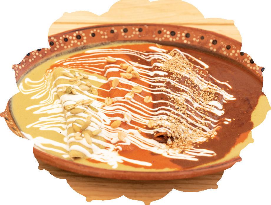 Enmoladas de pipián rojo o verde 3 tortilllas de maíz rellenas de pollo y bañadas de pipián rojo o verde, acompañadas con arroz rojo.