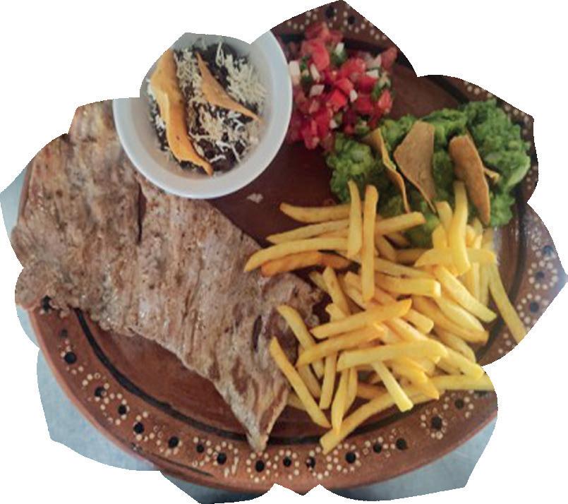 Acompañada de frijoles refritos, pico de gallo , guacamole y papas a la francesa.