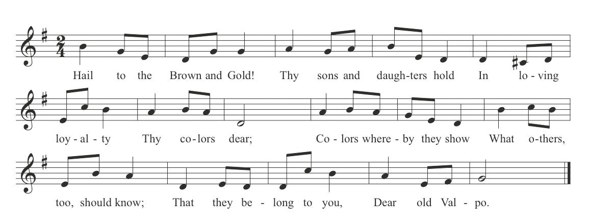 2. Hail to the Brown and Gold! Recall the days of old, The happy days which we Ne’er shall forget. As shadows longer grow, Brighter the flame shall glow, The flame of love for you –Dear old Valpo.