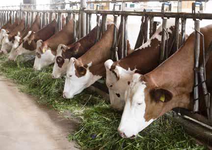 Oltre agli 8 ettari di pascolo, abbiamo 38 ettari di prati di montagna tra i 1350 a 1800 metri s.l.m. che vengono sfalciati per produrre fieno di qualità: pre-essiccato in campo e finito di essiccare sfuso nel fienile sopra la stalla, secondo un metodo tradizionale trentino. Le vacche hanno il fieno sempre a disposizione, erba fresca in mangiatoia a giugno e luglio, e ricevono un'integrazione a base di mangime: in media mangiano 20-30 kg al giorno di fieno ed erba medica comprata localmente, 6-7 kg di granaglie (orzo,