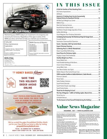 A Path for Families at Their Breaking Point............................................. 20 ACG Home Improvement....................................................................................43 AVB Bank................................................................................................................7 America’s #1 Holiday Feast Can be Conveniently Ordered Online for Storefront Pick-Up!.................................... ..............12 BA Med Spa & Weight Loss Center......................................................................11 BMW of Tulsa.........................................................................................................2 Black Hat Cleaning Services................................................................................33 Board & Brush Creative Studio............................................................................42 Bob Moore Chrysler Dodge Jeep Ram of Tulsa...................................................26 Buffalo Wild Wings.......................................................................................... 7,14 City of Wagoner, Your Christmas Destination.....................................................36 Combating Food Insecurity: The Third Annual Hops for Hunger Event ������������������� 4 Crusader Tactical..................................................................................................36 Destination Claremore/Visit Claremore................................................................6 Events - December, 2021 by Central Bank.............................................. 44 Expert Chimney Cleaning...................................................................... 16 Gathering Place is a Winter Wonderland............................................... 24 Gleam Guard Wood Refinishing.........................................................................34 Great Places for Christmas Lights........................................................... 22 Grigsby’s Carpet, Tile & Hardwood.......................................................................10 Healthy Weight Loss Plans...................................................................... 8 Honey Baked Ham.................................................................................................2 Inola Portable Buildings & Pole Barns.................................................................39 Intune School of Massage...................................................................................42 Jersey Mike’s Subs...............................................................................................48 Joan Marie Stickler, Hair Stylist...........................................................................36 Mother Nature’s Pest Control & Lawn Care..........................................................48 OSDH Launches Coalition to Battle Alzheimer’s, Seeks Recruits ��������������������37 Premium Cabinets...............................................................................................18 Reveal Salon...........................................................................................................6 Select Outdoor Solutions.....................................................................................23 South Pointe Chevrolet..........................................................................................3 South Pointe Chrysler Jeep Dodge......................................................................15 South Pointe Honda............................................................................................48 Thank You for Keeping Us Local............................................................. 28 The City of Wagoner: 1,000’s of Holiday Lights, Music & Fun ���������������� 40 Tile by Tony Inc.....................................................................................................14 USHealth Advisors...............................................................................................43 ’Tis the Season to Treat Yourself Kindly During the Holidays ����������������� 38
