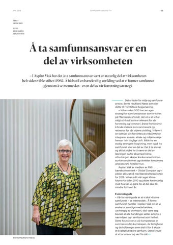 Det er leder for miljø og samfunnsansvar, Bente Haukland Næss som sier dette til Fremtidens Byggenæring. – Vi har siden 2015 hatt en egen strategi for samfunnsansvar som er tuftet på FNs bærekraftsmål, det vil si at vi har valgt ut 4 mål som er relevant for vår forretning og kommer i årene fremover til å bruke målene som rammeverk og rettesnor for vår videre utvikling. Vi lever i en tid hvor det forventes at virksomheter integrerer sosiale, etiske og miljømessige hensyn i sin daglige drift. Både fra en stadig strengere lovgivning, men også fra samfunnet vi er en del av. Det å ta ansvar og aktivt jobbe for å være en del av løsningen på for eksempel klimautfordringen skaper konkurransefortrinn, styrker omdømmet og tiltrekker kompetent arbeidskraft, forteller hun. Asplan Viak er medlem av FNS bærekraftnettverk – Global Compact og vi jobber akkurat nå med Bærekraftsrapporten for 2018. Vi har målt vårt eget klimafotavtrykk siden 2010 og jobber kontinuerlig med hva kan vi gjøre for at det skal bli mindre for hvert år. Forretningsidé – Vår forretningside er at vi skal «Forme samfunnet – se mennesket». Å forme samfunnet handler i Asplan Viak om at vi ønsker at samtlige medarbeidere, uavhengig av profesjon, skal være seg bevisst at alle handlinger setter avtrykk; i nærmiljøet og i samfunnet som helhet. Dette forutsetter at vår kompetanse er summen av den kunnskapen, de ferdigheter og de holdninger som skal til for å skape et kvalitativt bedre samfunn. Dette krever at vi tar ansvar og sier fra når >> Bente Haukland Næss