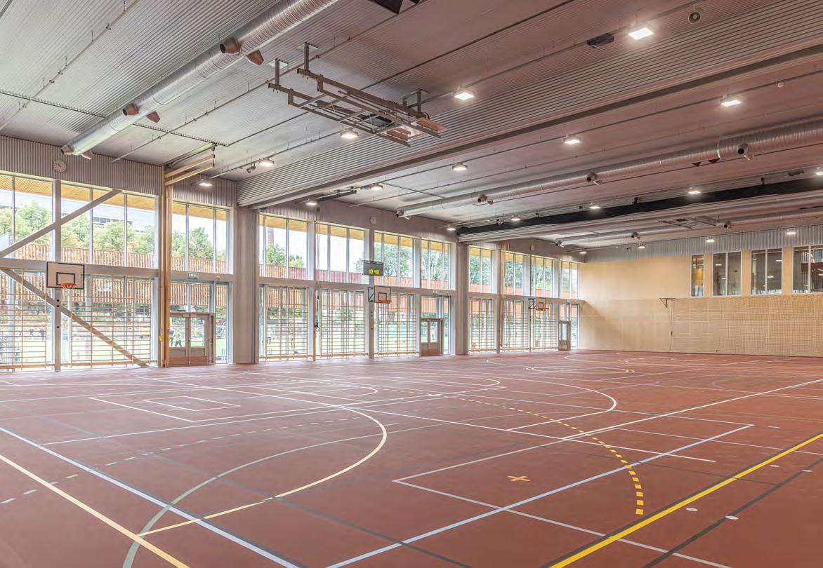 – Kryssfiner i bjørk er en gjenganger i selve idrettsarealet, både fordi det er et fint materiale som gir variasjon på store flater, men også fordi det er et solid materiale som kan benyttes på mange måter. Der må jeg berømme entreprenøren med et fantastisk flott arbeid. Vi bruker i tillegg tradisjonell slipt betong på gulv og kryssfiner og metall i himlinger i publikumsarealene. Her har vi naturligvis tenkt på at alt skal tåle en del røff bruk.