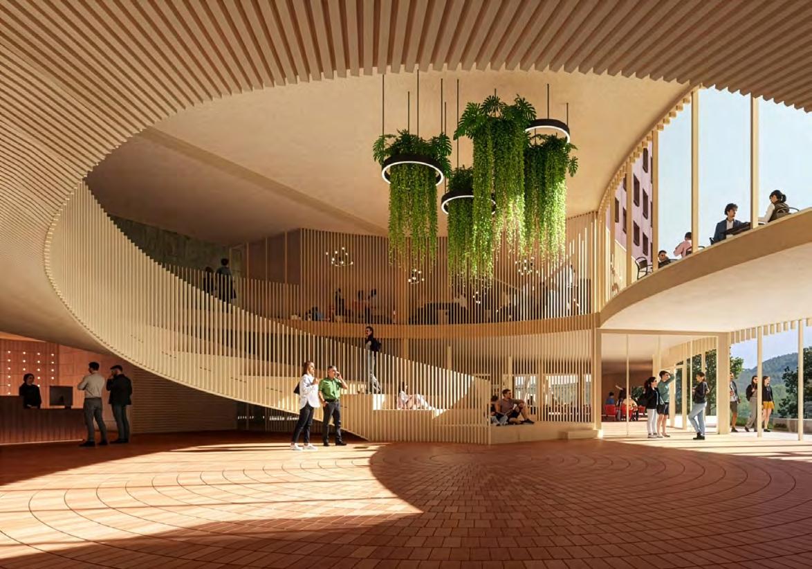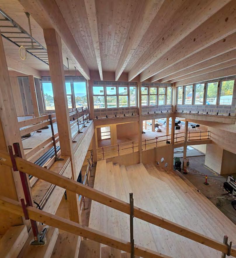 Nye Vesterøya skole i Sandefjord bygges med prefabrikerte element i massivtre. Summen av materialvalg reduserer byggets klimagassutslipp med 40 prosent sammenlignet med referansebygg.
