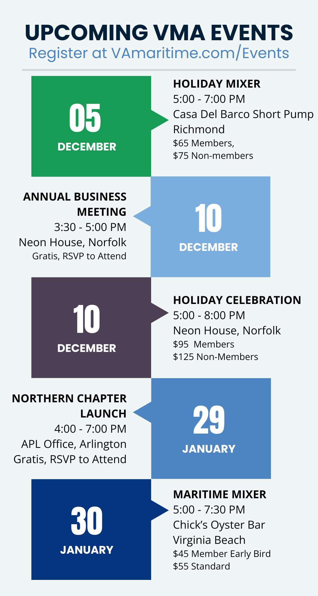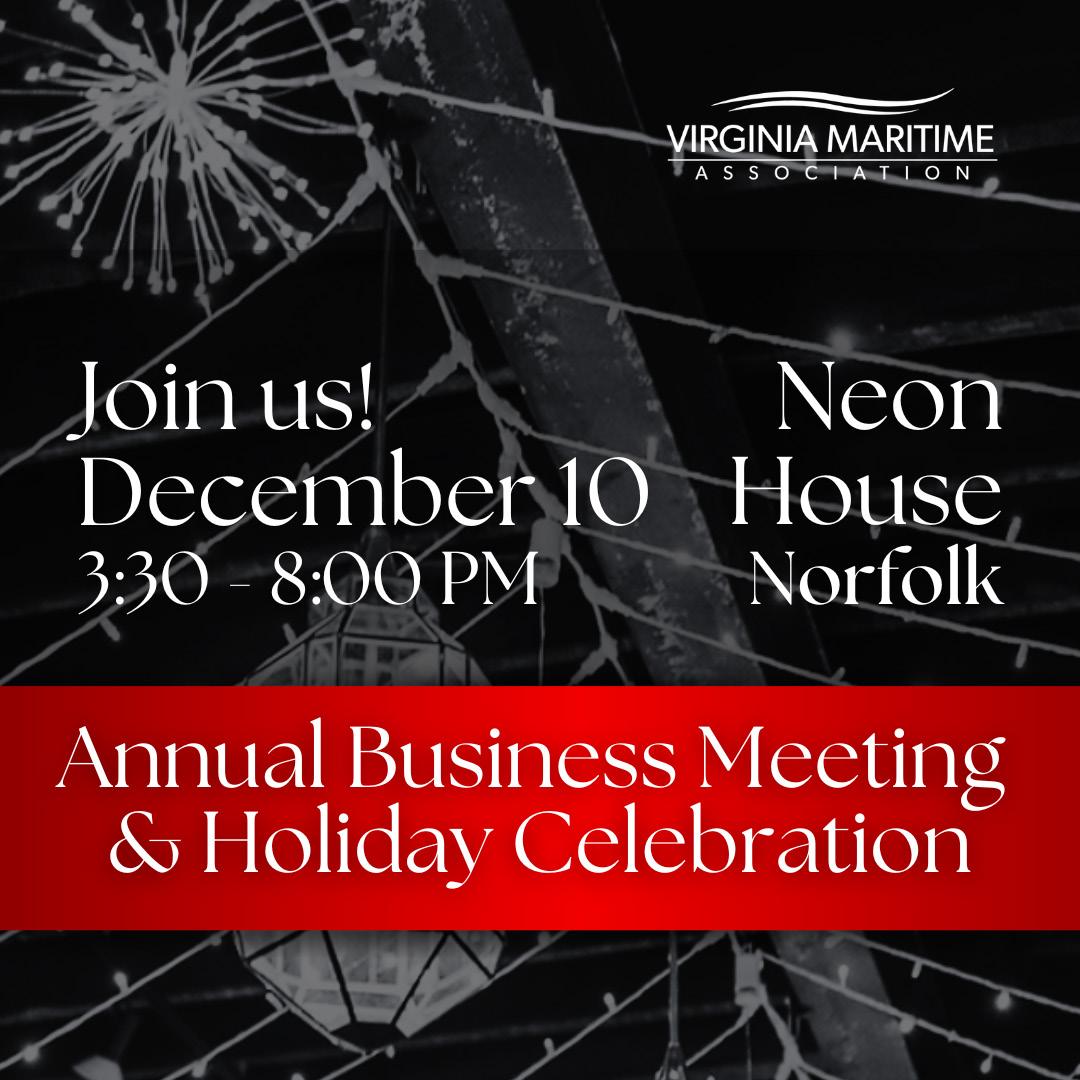 The Virginia Maritime Association invites you to our Annual Business Meeting and Holiday Celebration on Tuesday, December 10, 2024, at the Neon House in Norfolk. The Annual Business Meeting is free to attend, providing a look back at the year’s accomplishments, election of officers and directors, and insights for 2025.