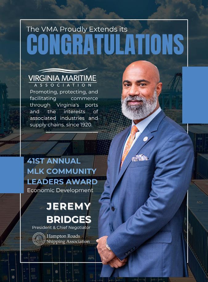 Jeremy Bridges, President & Chief Negotiator of the Hampton Roads Shipping Association (HRSA), was honored on January 16th at the 41st Annual Urban League of Hampton Roads MLK Celebration for his remarkable contributions to economic development.