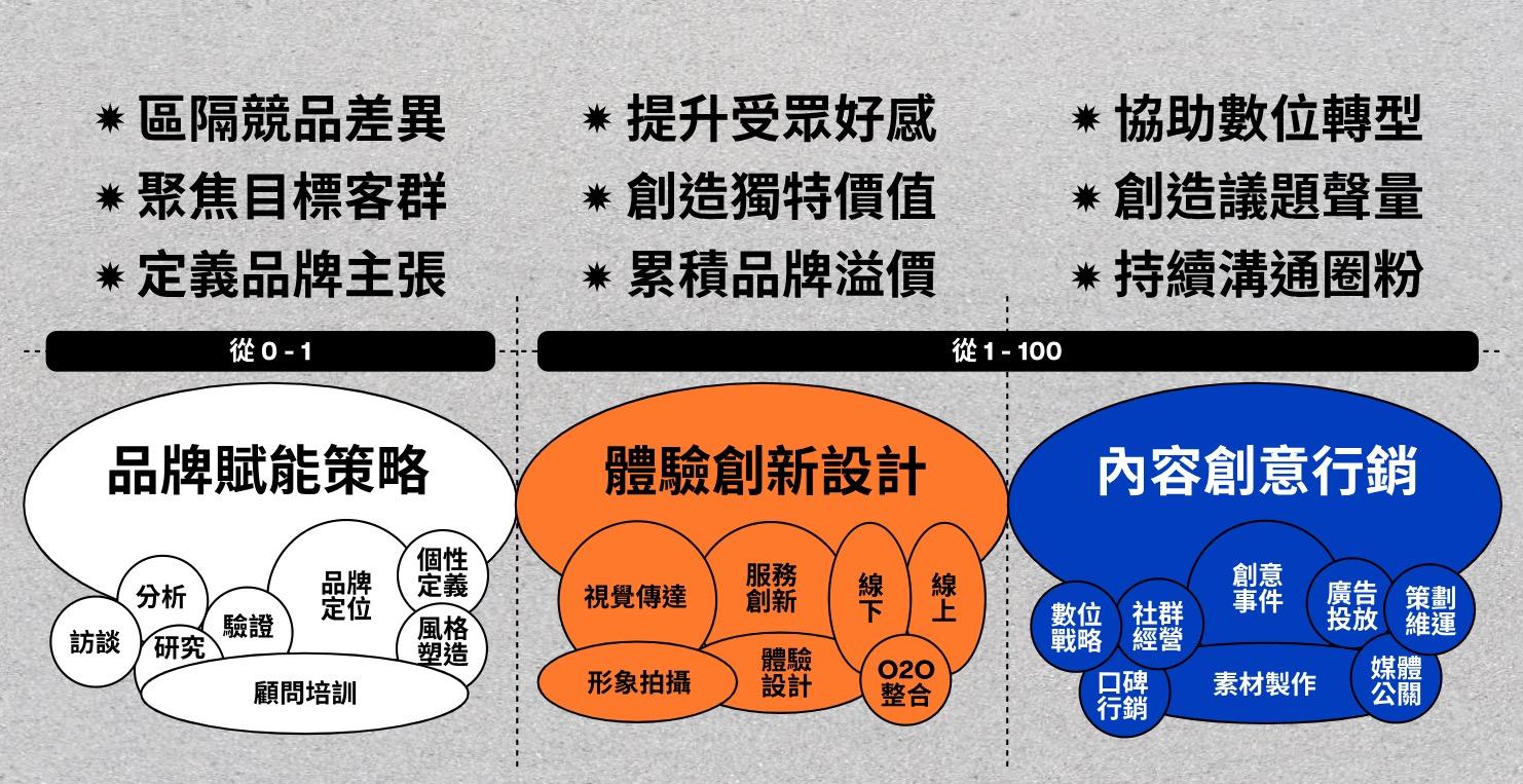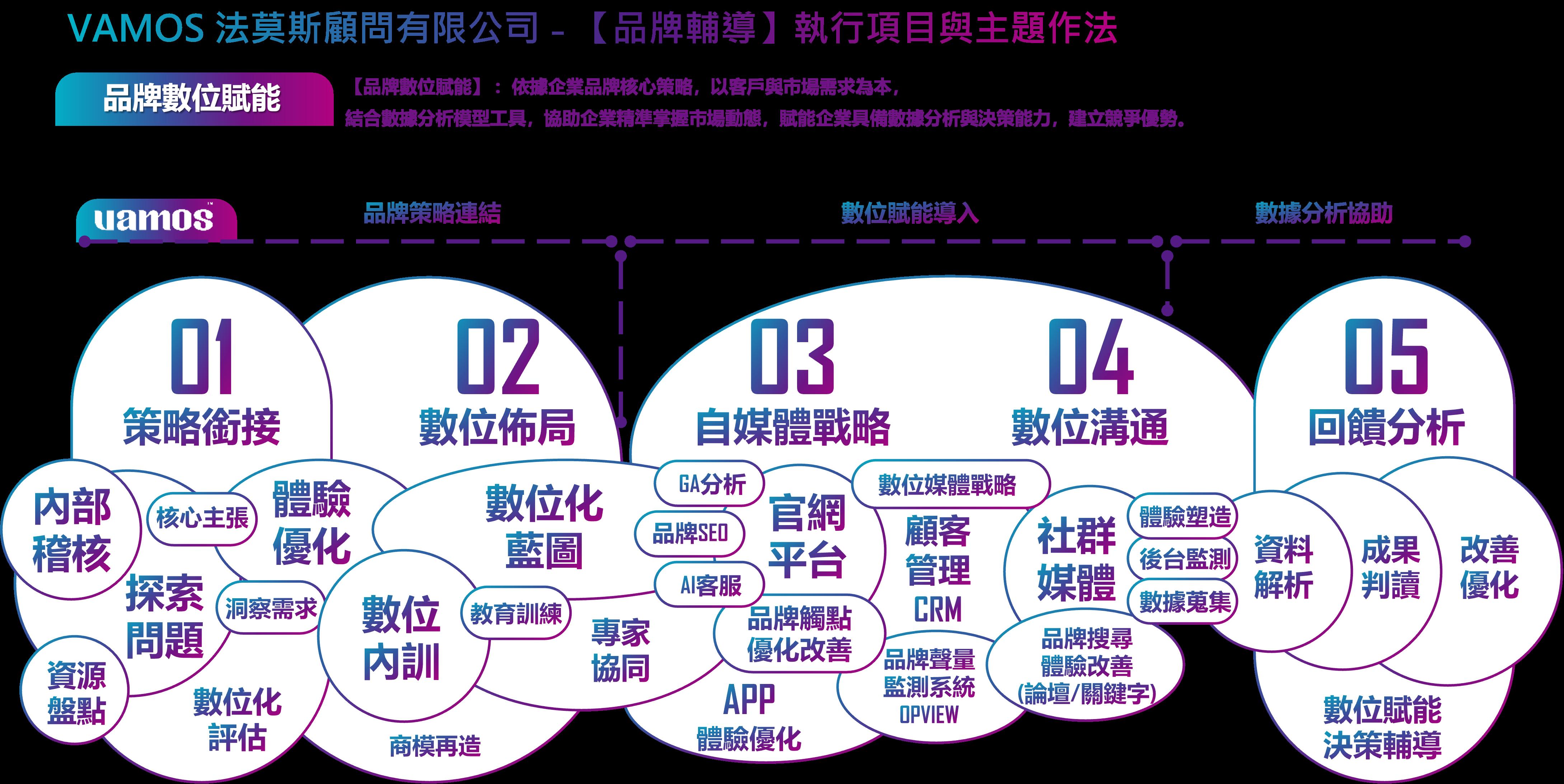 ▇ VAMOS在品牌體驗的創新與塑造,以理性策略與感性創意結合 ,為品牌洞察問題,並診斷提出解決方案,務實的陪伴顧客大步邁前! 一、品牌賦能策略:市場分析驗證|品牌策略再造|數位轉型服務 二、內容創意行銷:社群內容行銷|檔期創意活動|數位創新體驗 三、體驗設計創新:品牌識別設計|沈浸式品牌設計|場域體驗設計