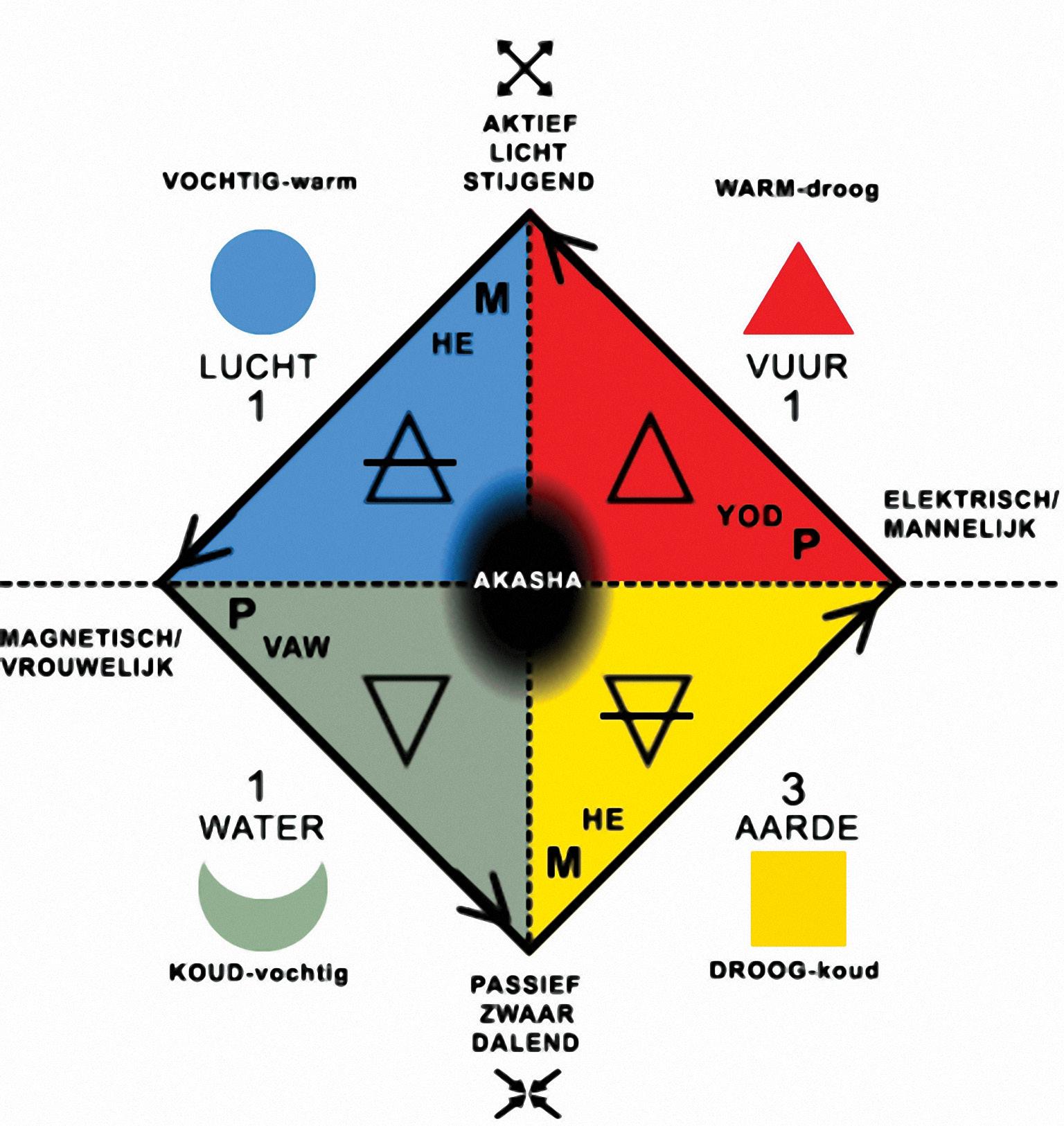 Hieronder nog een keer in een illustratie het totaaloverzicht van de Elementen met toevoeging van de uit de tantrische poot van de Hermetica afkomstige tattwa’s om de elementen mede aan te duiden. De letters P en M staan voor Primair en Mediator.