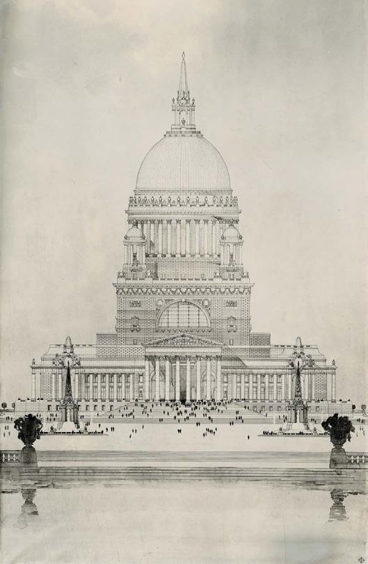 “The main feature of interest and excellence in this projet was its great imaginative quality. Explaining his conception by quotation from Zangwill: ‘New York the crucible, where the great alchemist melts and fuses with his purifying flames the Celt, Saxon, Slav and Teuton, Latin, Greek, Syrian and Jew, into a new Race, rising Phoenix-like from the fire, PeacePeace, to all ye unborn millions, destined to fill this great continent where all races and nations come to labor and look forward; here shall they all unite to build the great Republic of Man’: The author of this design endeavored to put this idea into architectural form.” imagination and originality.” They reserved their enthusiasm for the creator of secondplace entry, whose name and drawings are not in our archives. Their commentary refers to the 1909 play The Melting Pot by Israel Zangwill, which celebrated America’s absorption of immigrants.