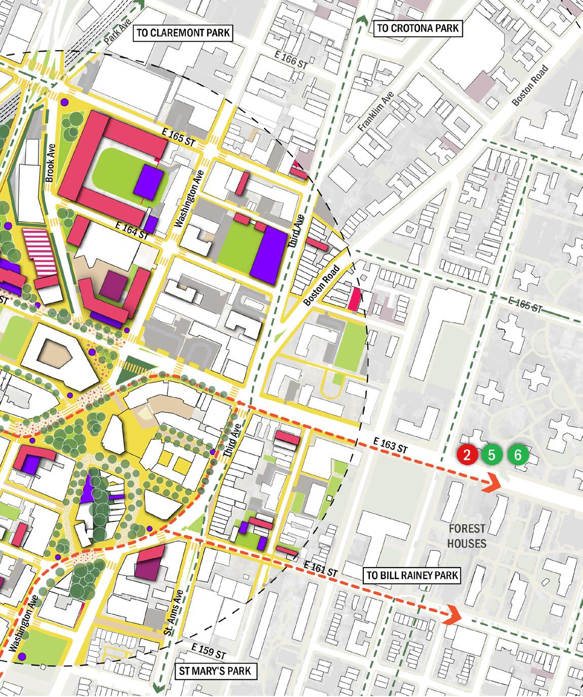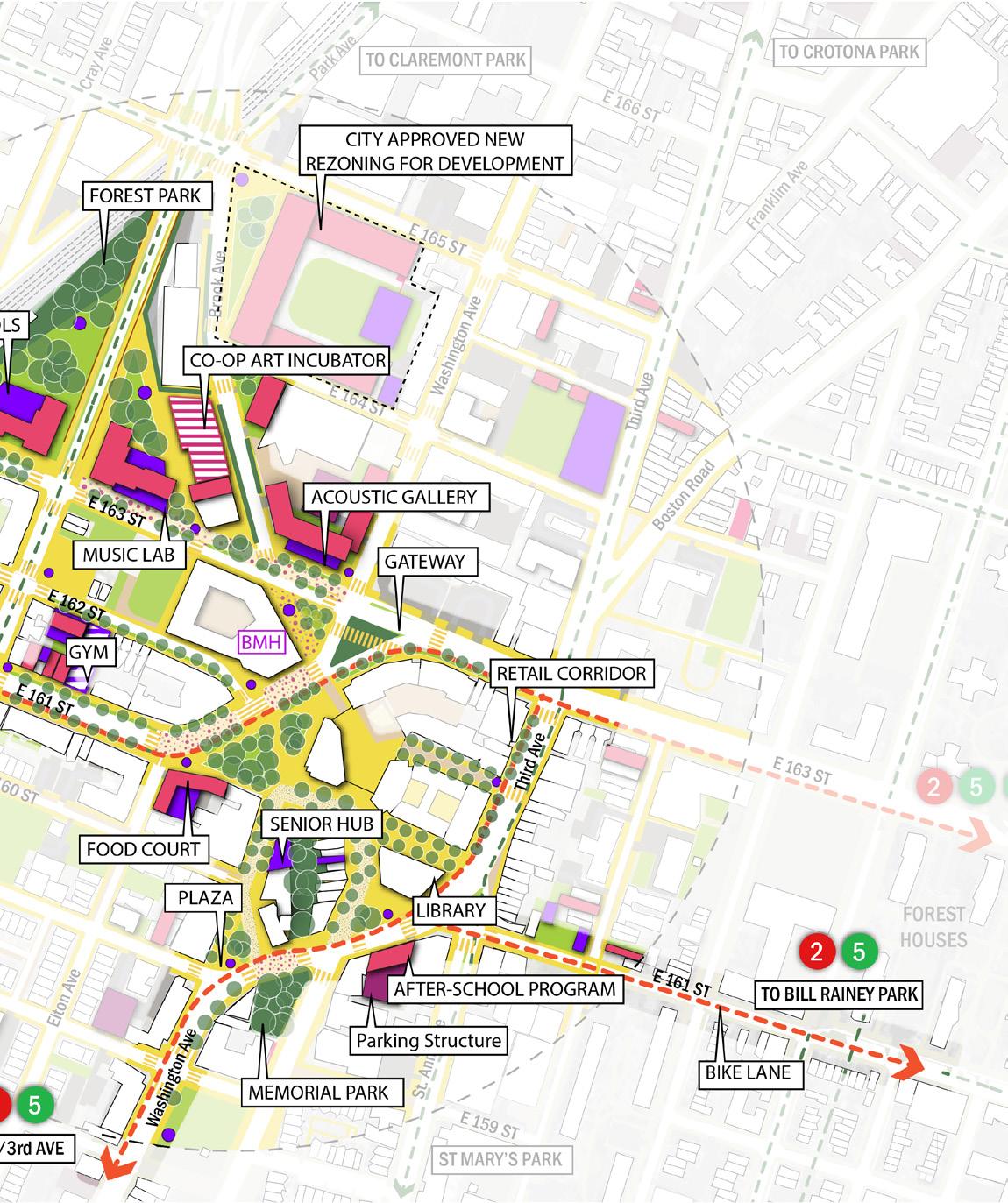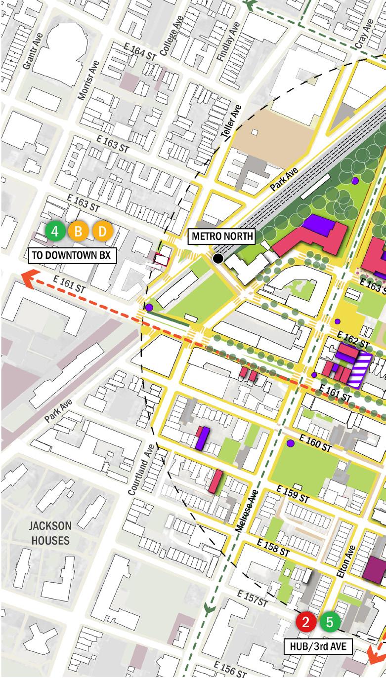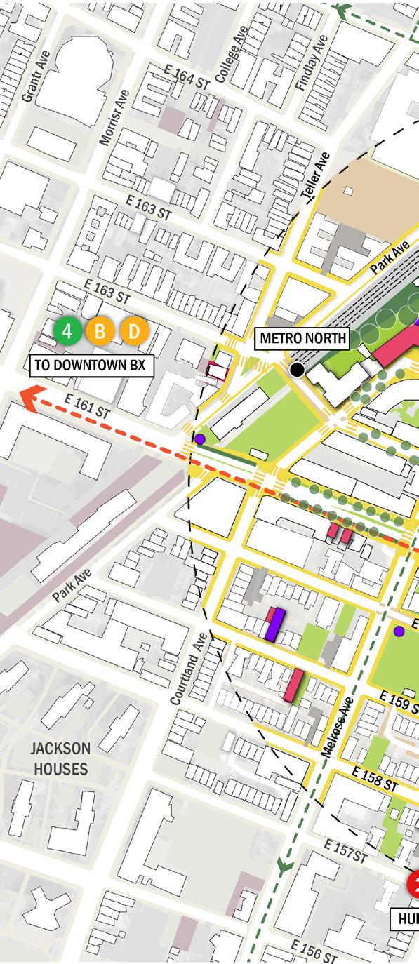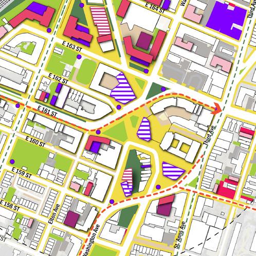 • Differentiate the asphalt treatment around the 42nd Precinct block to strengthen the north–south connection—linking the Bronx Music Hall, Boricua College, and future development towards The Hub.
