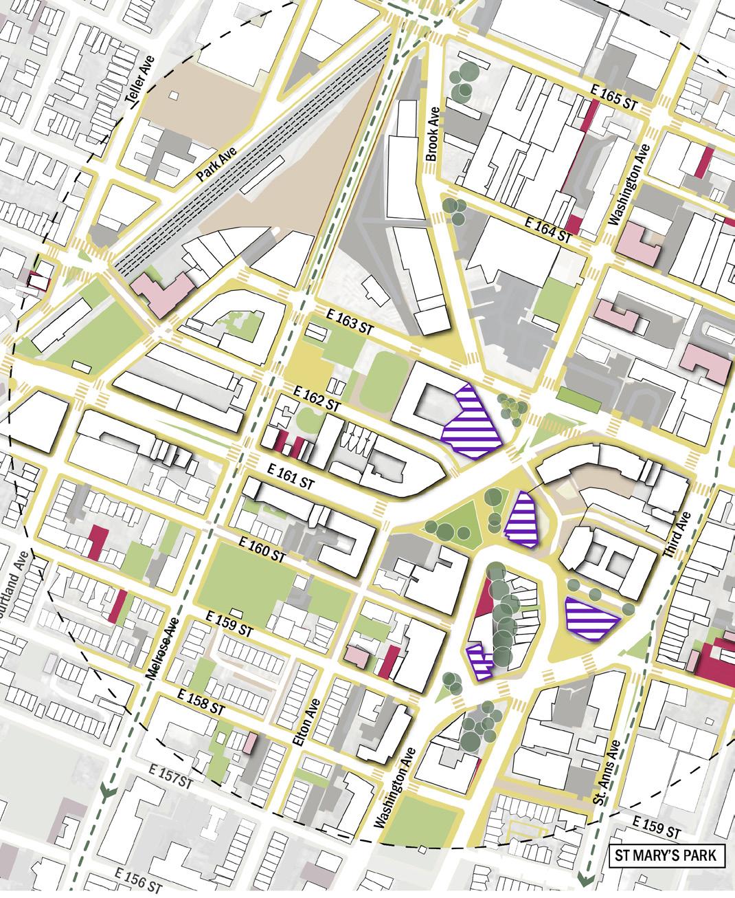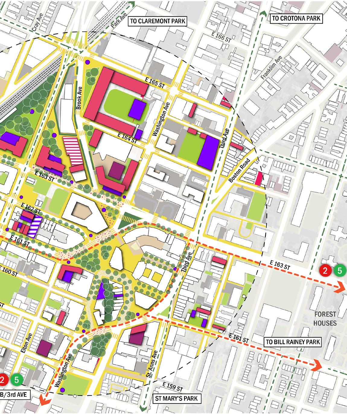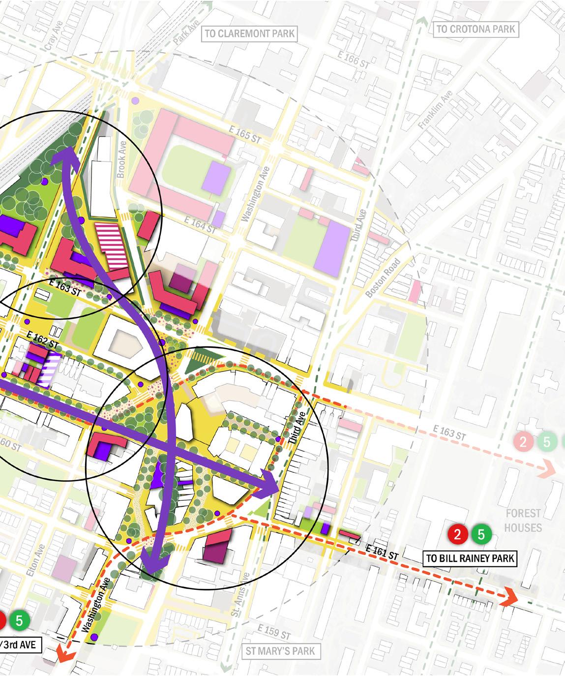 • Differentiate the asphalt treatment around the 42nd Precinct block to strengthen the north–south connection—linking the Bronx Music Hall, Boricua College, and future development towards The Hub.