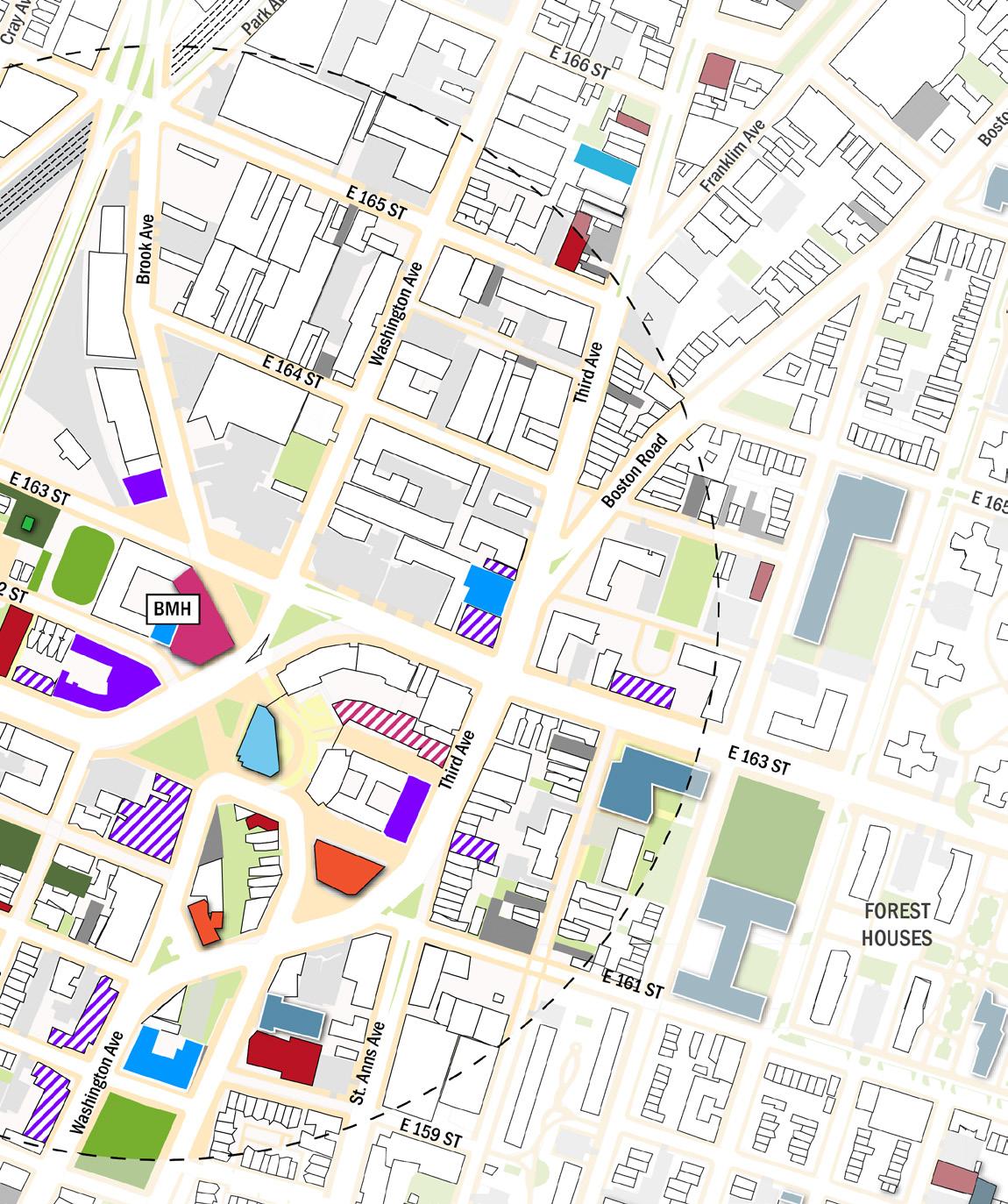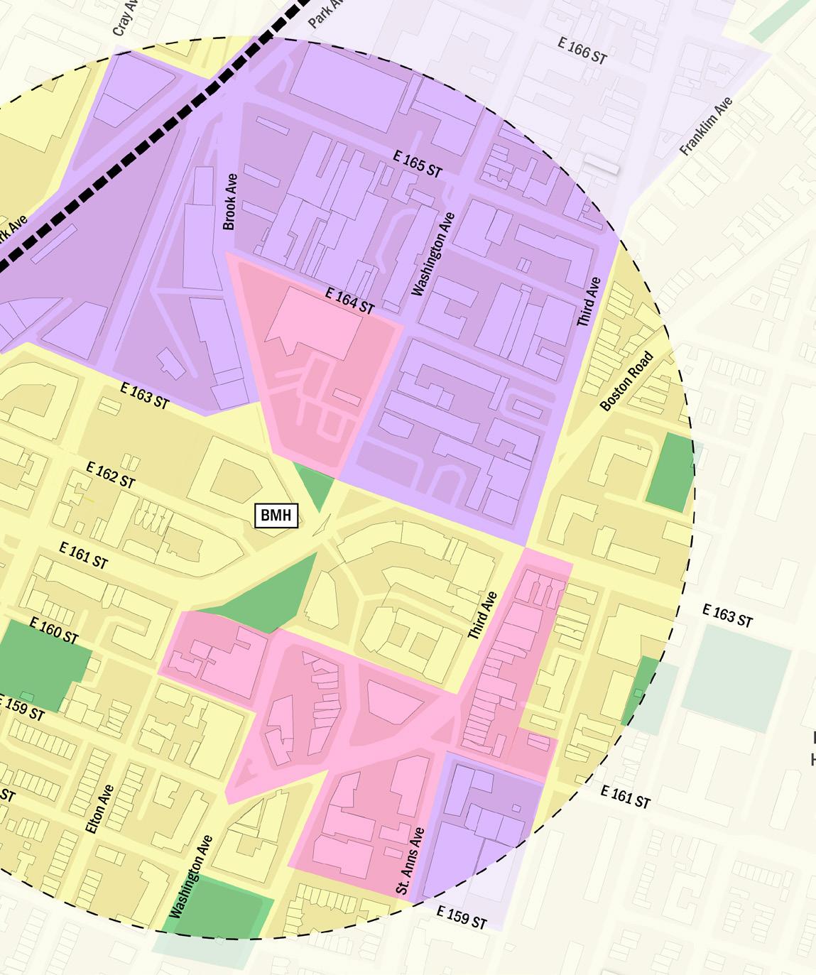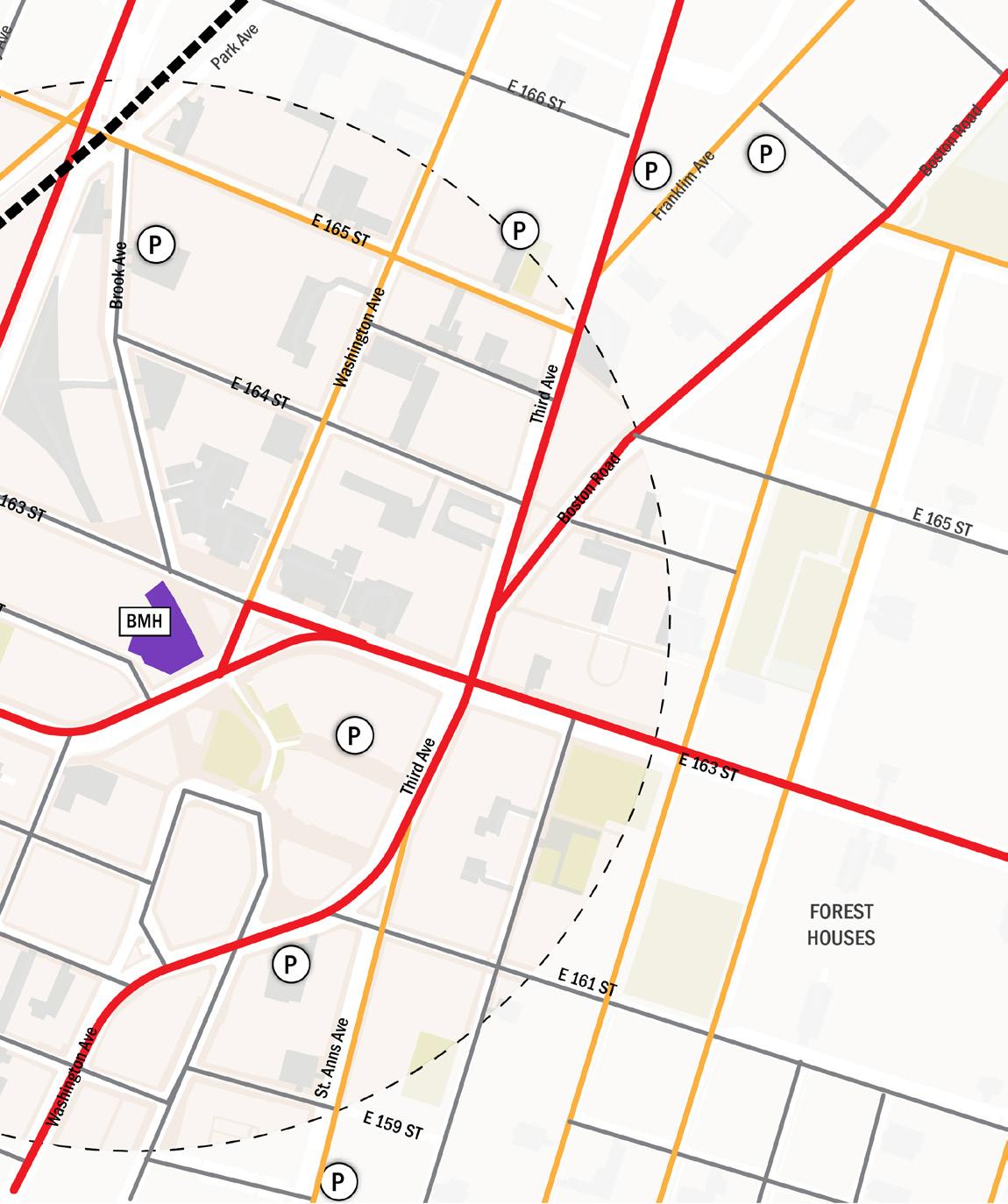• BMH sits along E163rd Street, a corridor dominated by parking and industrial uses that creates a strong edge condition, including a gas station and a major traffic intersection.