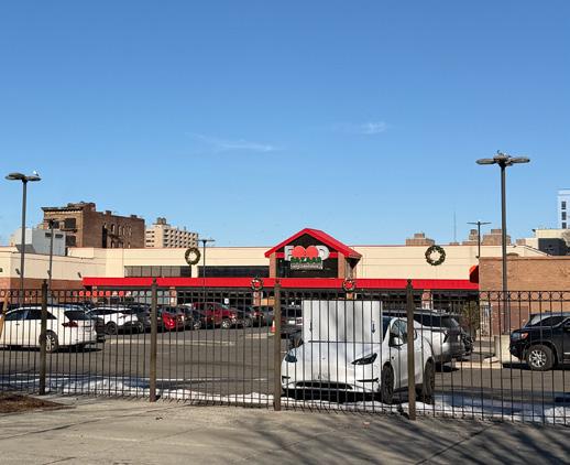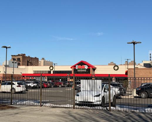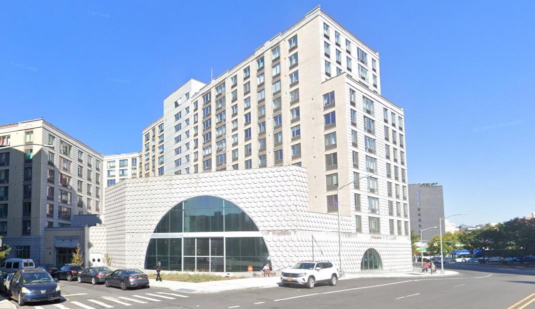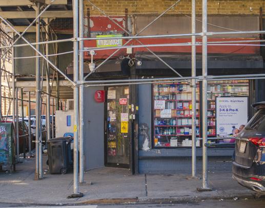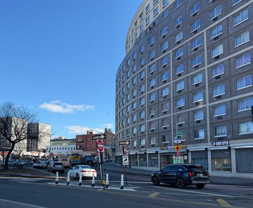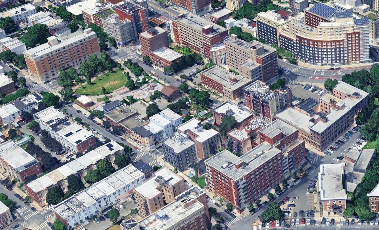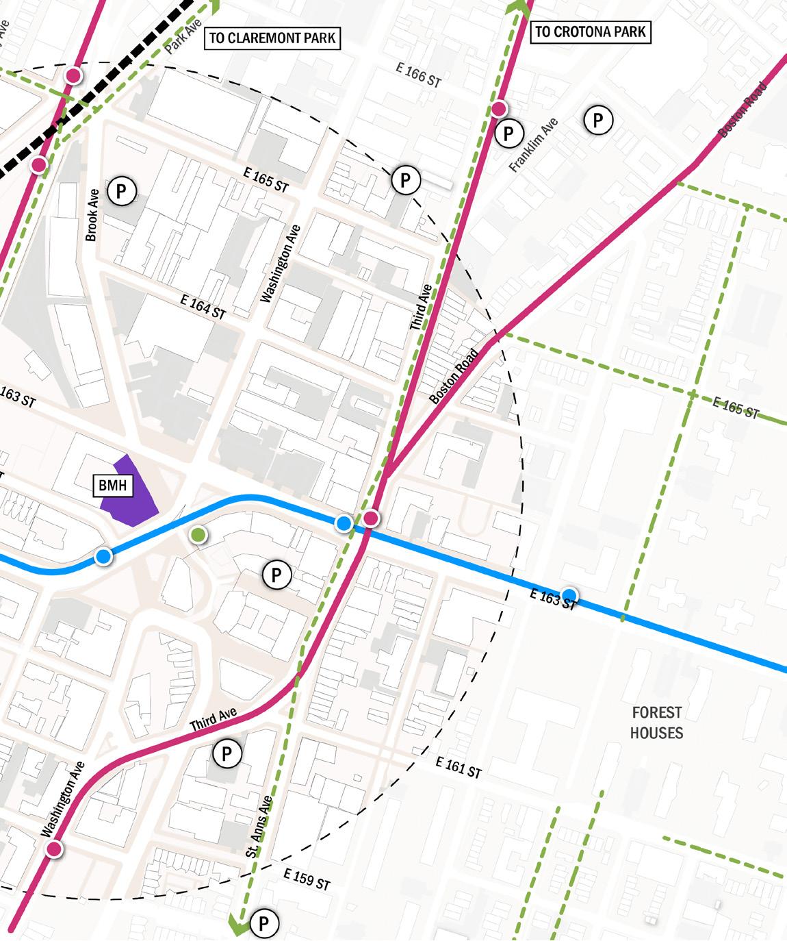 • BMH sits along E163rd Street, a corridor dominated by parking and industrial uses that creates a strong edge condition, including a gas station and a major traffic intersection.