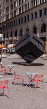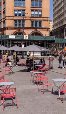 Temporary seating placed on sidewalks around cultural anchors and local businesses.