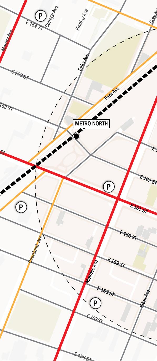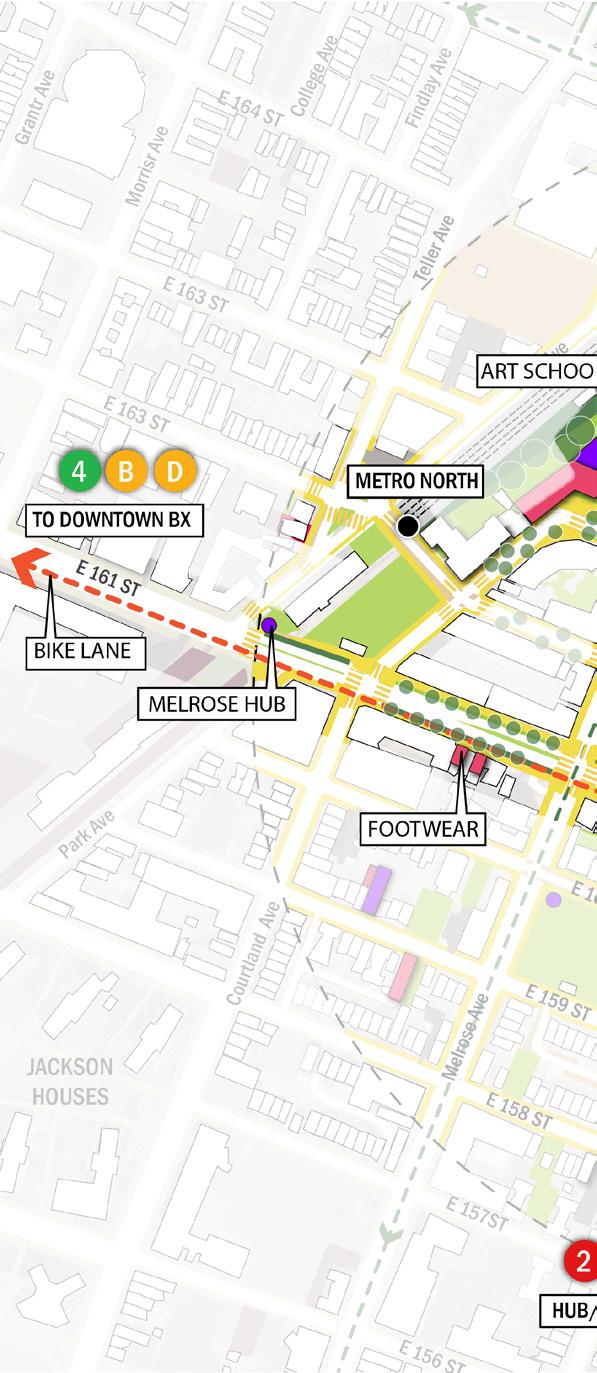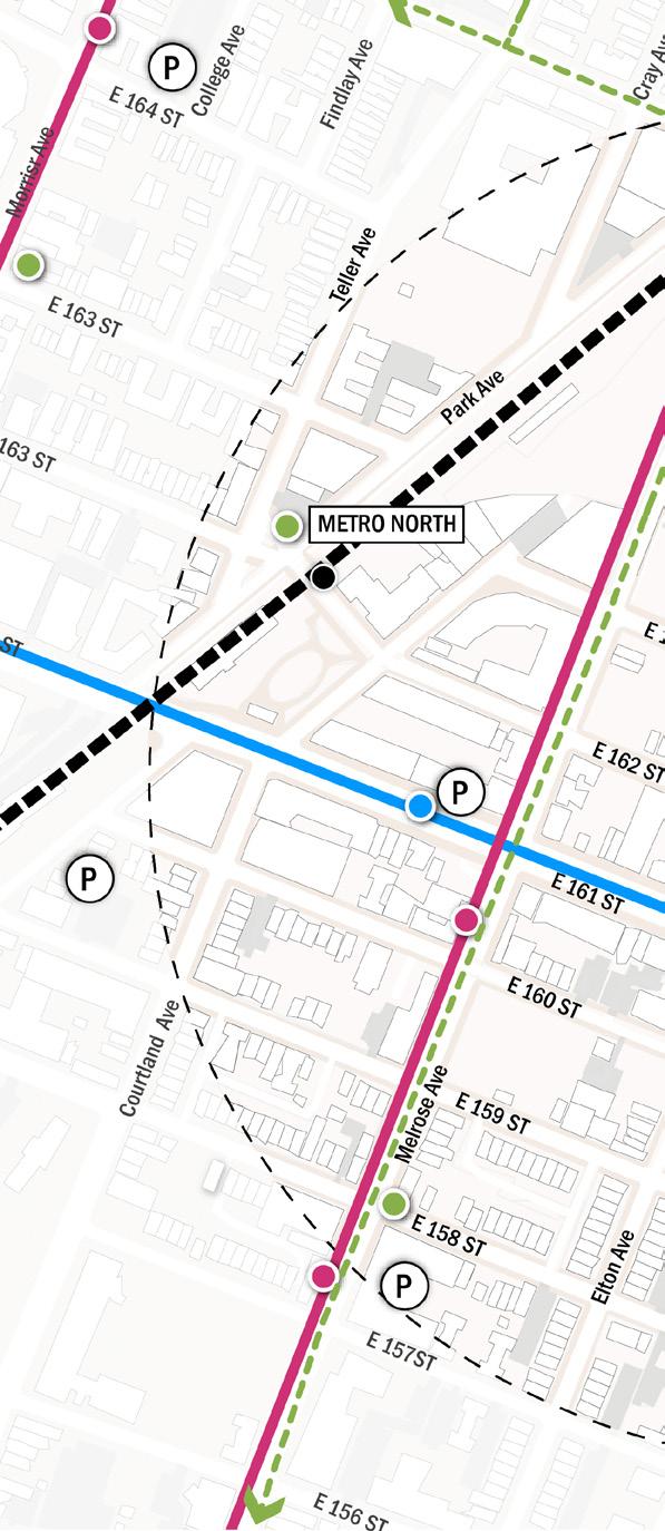 Introduce a two-way bike lane along East 161st Street and Third Avenue to strengthen connectivity and improve access to transit, waterfront amenities, The Hub, and Mott Haven. Advance accessibility and operational improvements at the Metro-North station, building on recommendations from DCP’s Melrose MetroNorth Station Area Study.