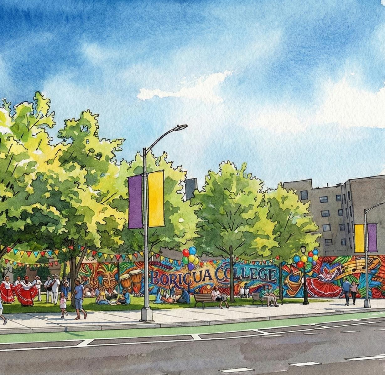 • Paint a mural reflecting the community’s cultural identity on the wall adjacent to Boricua College.