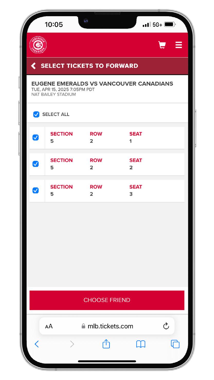 4. Choose the tickets you want to forward, then click “CHOOSE FRIEND” at the bottom of the page.