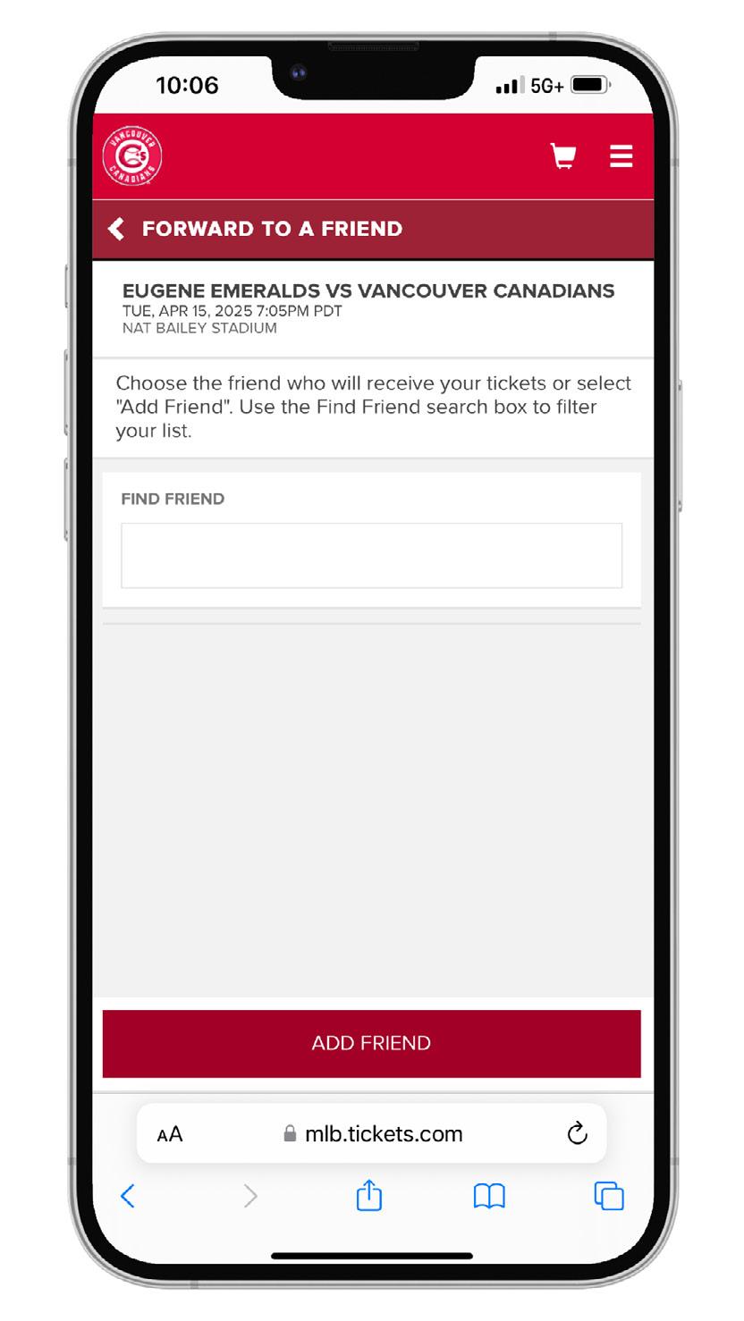 6. Choose the friend who will receive your tickets. After selecting a friend, click “FORWARD TICKETS” at the bottom of the page or “ADD MORE TICKETS” if you wish to forward additional tickets. Please review and confirm the recipient before forwarding your ticket(s).