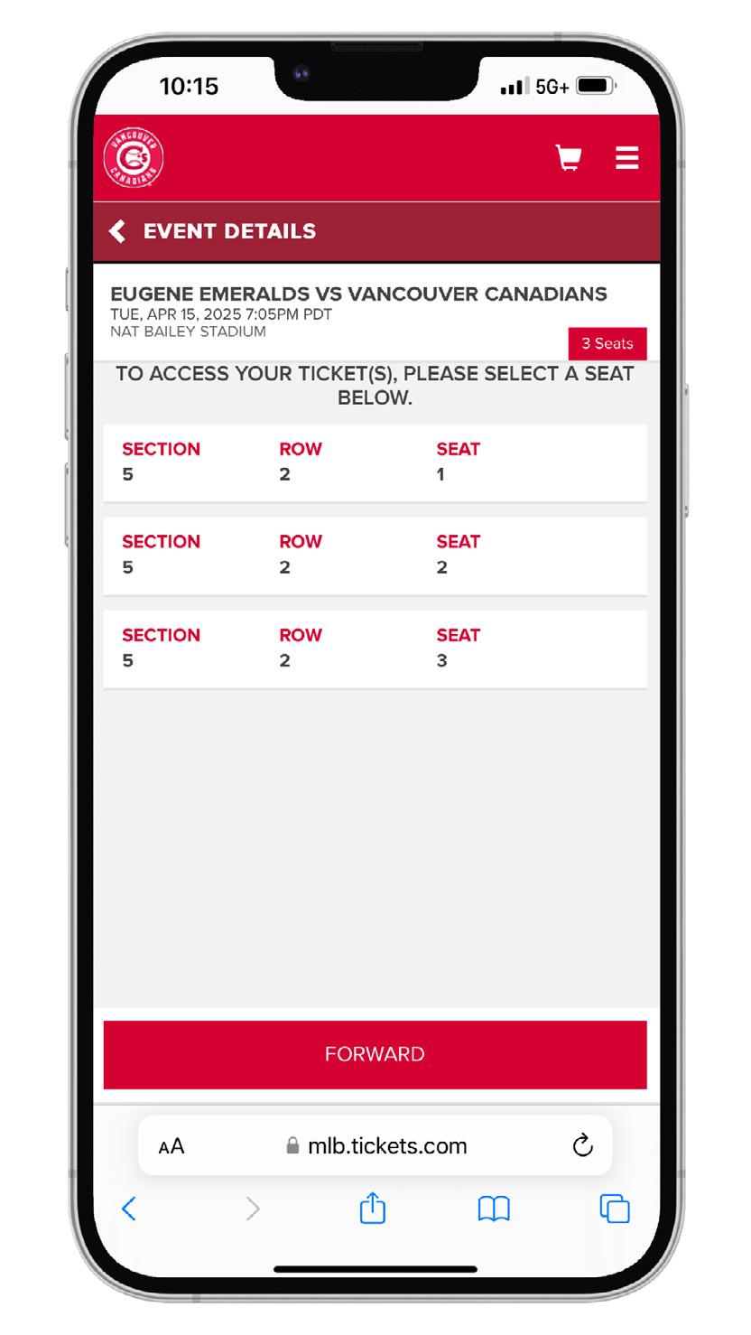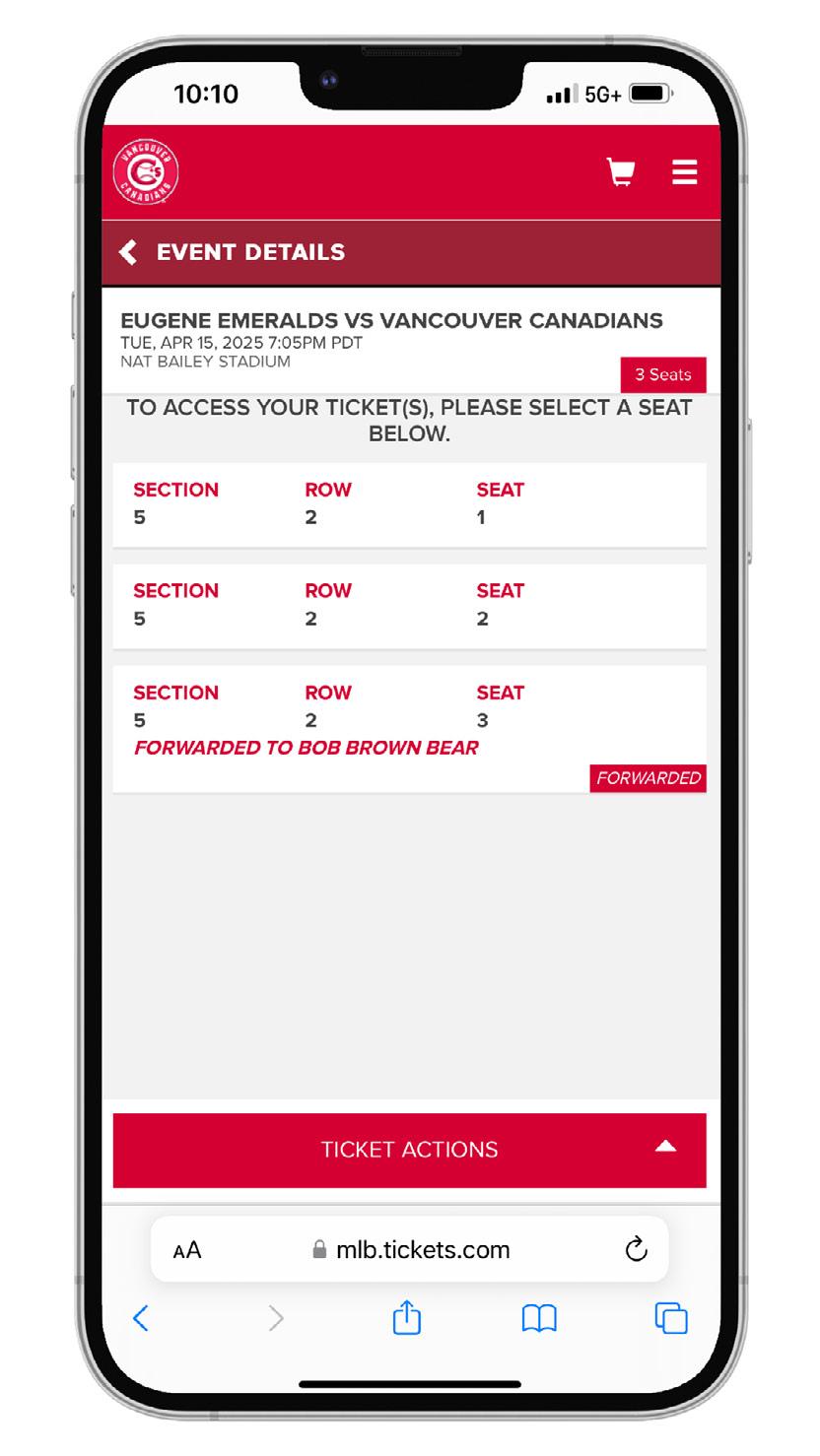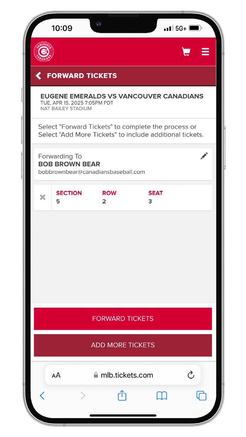 WHAT IS FORWARDING? FORWARDING TICKETS THROUGH YOUR MY C’S TICKET ACCOUNT IS THE BEST WAY TO DISTRIBUTE YOUR SEASON TICKETS. WHETHER YOU ARE GIFTING TICKETS TO A FRIEND OR FAMILY MEMBER, THANKING SOMEONE FOR A JOB WELL DONE, OR LOOKING TO TREAT A POTENTIAL BUSINESS CLIENT TO A GAME AT THE ‘NAT, FORWARDING TICKETS TO THE GAME IS A CONVENIENT WAY TO DIGITALLY DISTRIBUTE YOUR TICKETS. ALL YOU NEED TO FORWARD YOUR TICKETS IS THE FIRST AND LAST NAME OF THE TICKET RECIPIENT, AS WELL AS THEIR EMAIL ADDRESS.