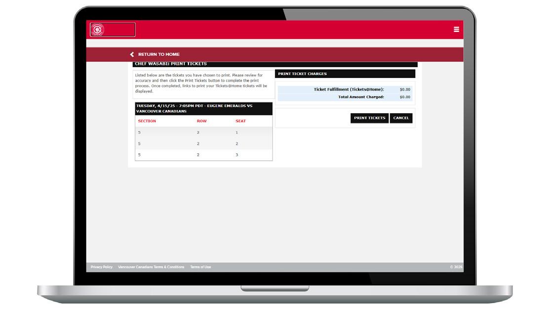 4. Confirm the game(s) and seat(s) you have selected for printing by clicking “PRINT TICKETS.”