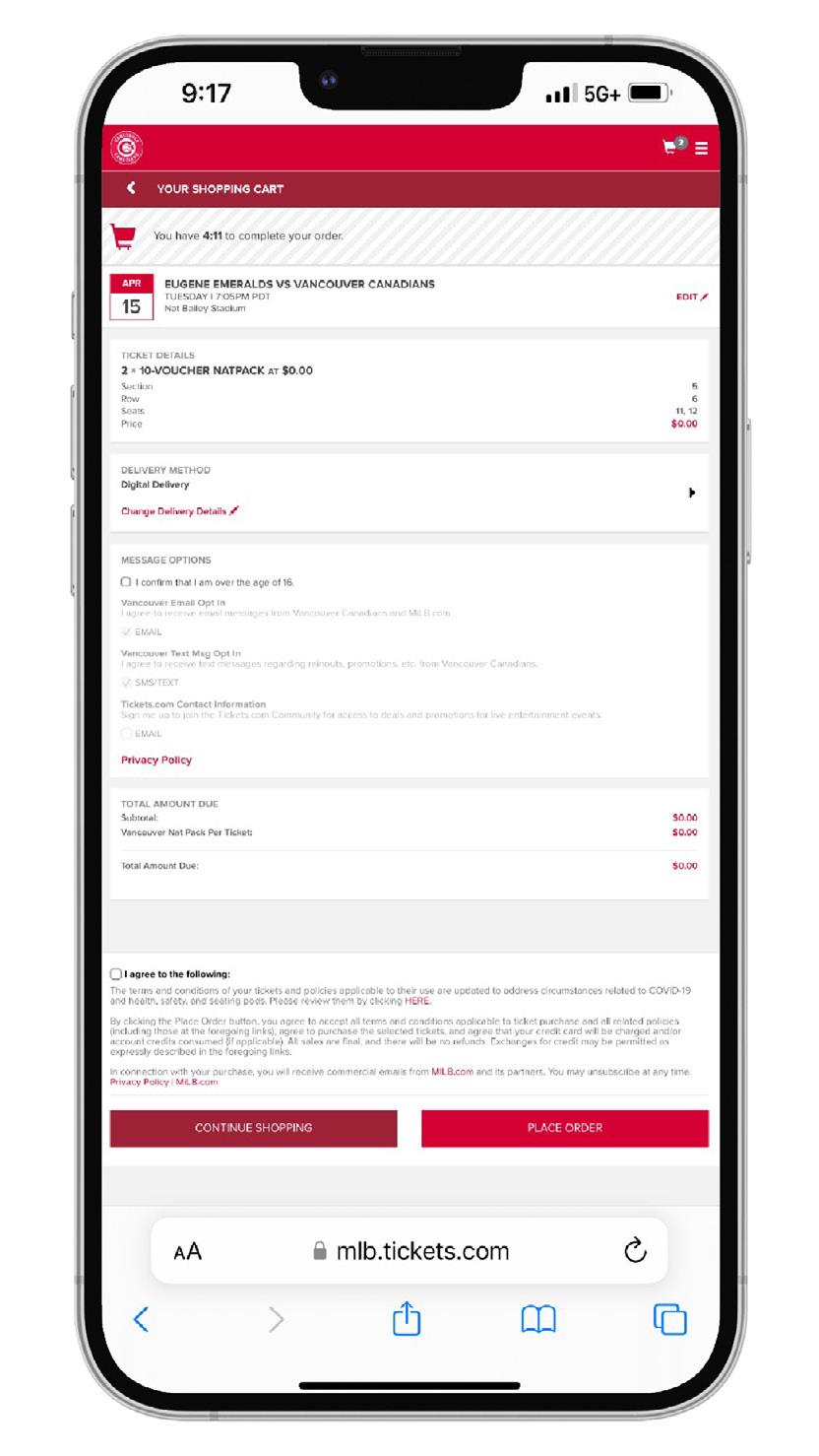11. A final summary of your order will appear. Please double-check your game and seat selection before placing your order. Confirm your game, seat location, and agreement to the terms and conditions before clicking “Place Order.”