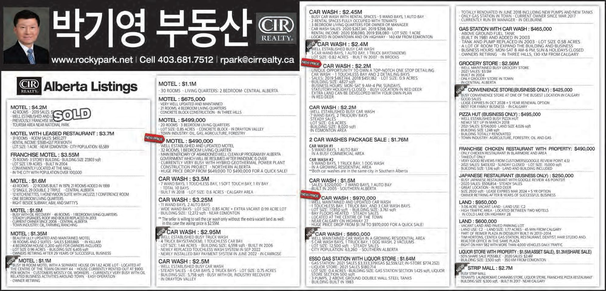 2022년 10월 1일 토요일C12 조선일보 Sutton Group Westcoast Realty #301-1508 W. Broadway Vancouver V6J 1W8 www.bopark.ca 박보영 부동산은 쉬지 않고 여러분들을 위해서 뜁니다. 박보영 부동산 Vancouver West 전문 Realtor “29년 경력의 전문가” Bo Park(박보영) 직통 : 604) 377-7899 Email : bo@bopark.ca ■ 전문 지역 ■ Vancouver WestㆍDowntown YaletownㆍCoal Harbour 이태종 (TJ Lee) www.tjlee.ca 4 Residential Properties 4 Acreage Homes 4 Business 4 Commercial Properties MISSION/ABBOTSFORD 지역 #360 - 3033 Immel St, Abbotsford, BC V2S 6S2 ● Cell : 604-302-8216 ● Office : 604-859-3141 ● email : taijonglee@shaw.ca HomeLife Advantage Realty (Central Valley) Ltd. $229,900 Brunch Cafe (Mission) · MLS# C8040357 · 미션 Local 고객들로 아주 바쁜 서양식당 · 단독건물, 실내 38석, Covered Patio 30석 · Open 7am - 3pm (Wed. closed) · 현재 월매상 4만불이상 · Monthly gross rent $2,907+gst Restaurant Lease Opportunity 아보츠포드 지역 · 단독건물, Floor Area 2,200 sqft, 대지 17,921 sqft (넓은 주차장) · Cafe로 오랫동안 운영되었던 식당 · Commercial kitchen, 10 ft hood, 60-70석 · 첫 두달 렌트 free. 세째달 렌트 $3,000 (재산세 및 GST포함)이며 매달 $100씩 인상하여 $5,000에서 고정. · 18개월 운영후 Business Assets (장비 및 인테리어) 10만불에 인수가능 $459,900 (Mission) 아파트 · 15년 된 869 sqft 1Bed 1Bath Condo · 미션에서 가장 좋은 위치에 있으며 가장 고급으로 잘 지어진 아파트임. · 단지가 Heritage Park와 면해있어 단지밖만 나가면 바로 공원이라 산책하며 Fraser River와 Valley view를 즐길수 있음. · 3층 건물 2동이고 총 70세대인 Gated complex Full Service Hotel (AB) · Asking: $7.5M · 68 Rooms + 13 Units의 별도 건물 Suites · 꾸준한 $1M 이상의 Room Sales · 10 VLTs와 Tavern, Lounge, Liquor Store · Near Big City High Volume Gas Station + Car Wash (2 Bays) (BC) · Asking: $5.35M · 주변 관광지 많은 B.C. Town · 꾸준한 매출, 안정적인 수익 · 2022 FY Gross Sales; $7.6M Gas Station + Liquor Store + Living Quarter · Asking: $3.9M · Fort McMurray Area · 급속히 회복되는 매출 · 2022 FY Gross Margin Over $1Mil 예상 Convenience Store + Liquor Store (SK) · Asking: $735,000 · Gross Sales 1.3M · Sales 계속 상승중, 올해 매출 $1.6M 예상 · Renovated Commercial Kitchen, 2 Bedroom Living Quarter Gas Station + Car Wash(3 Bay) (AB) · Asking:$1.99M · Near Edmonton · New Pumps & Gas Storage Tanks (Double Walled Fibre Glass) · Gas($2M), Store($1.2M), Car Wash($70,000) 진병원·모니카 진 부동산 BC, AB, SK주 Licensed Realtor Western Canada 모든 지역의 매물 상담 가능합니다. 403-554-9784 bbwjin@shaw.ca monicajin@shaw.ca westerncommercialproperties.ca MaxWell Capital Realty(Calgary), Re/Max Bridge City Realty(Saskatoon) NEW NEW NEW NEW Gas Station + Car Wash(6 Bays) (SK) · Asking: $5.85M · 매년 크게 오르는 매출 · SK주 대도시 · 2016년 Renovation과 새로 건축한 Property · NOI(Net Operating Income) Over $1M Gas Station + 21 Unit Lodge + 2 Bays Food Court (SK) · Asking: $6.9M · 매출 올라가고 있는 가능성 많은 사업체 · 독립 건물 형태의 21 Unit의 Lodge와 Recreation Center · !4 Acre의 넓은 땅 · Seller Financing 가능 Franchise Motel on Busy HWY(AB) · Asking:$4.9M · 81 Rooms · 7 Acres의 넓은 땅 · Well Built & Well Kept Building · 지난 1년 Room Sales $1.5M Gas Station + Leased Liquor Store (AB) · Asking:$2.95M · Near Calgary(40 Minutes) · 교통량 많은 도로 선상 · 안정적인 Rental Income과 잘 관리된 Property · Gross Margin; $580,000 Motel + Strip Mall(7 Bays) (AB) · Asking: $4.99M · Alberta 대도시의 Good Location · Renovation 잘 된 78 Room Motel · 꾸준한 Rental Income과 상승중인 Room Sales · 2 Bedroom의 Living Quarter NEW NEW NEW NEW NEW C/S C/S