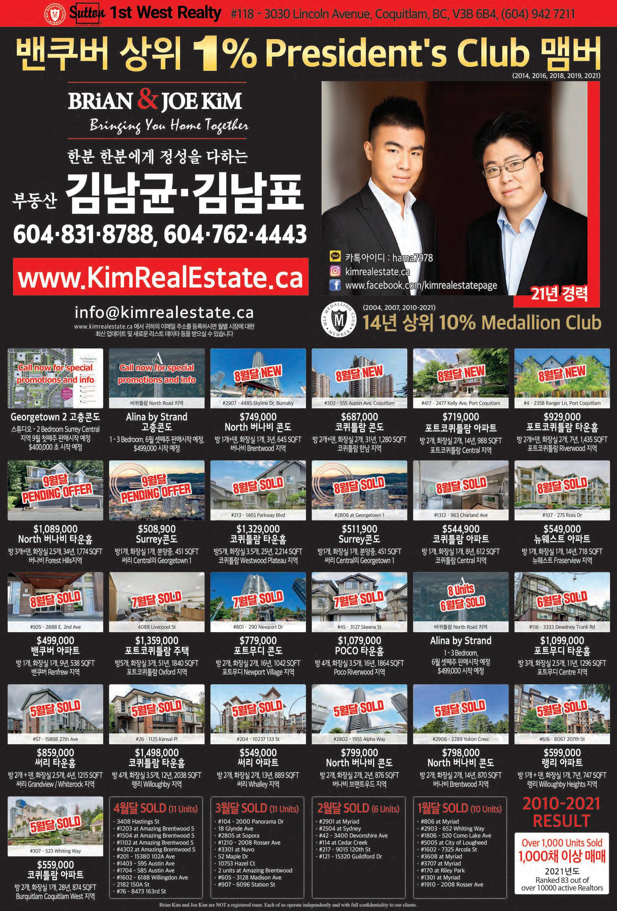 2022년 10월 1일 토요일C10 조선일보 건축공학 및 건설관리전공 리얼터. 전문성에서 앞서갑니다! #140 4664 Lougheed Hwy Burnaby BC V5C 5T5 TEL: 604-299-9680 Sutton Group 1st West Realty 604.781.3467 rick.royal1st@gmail.com 우종훈 부동산 2015 - 2021 7년 연속 광역밴쿠버 TOP 5% REALTOR 비즈니스 매매 2015 2016 2017 2021 2018 2019 2020 사우스 써리 $2,200,000 대지 면적 6,104 sq.ft 실내면적 4,774 sq.ft 방 6개 화장실 7개 조용한 주택가 남향집 주변 좋은 학군과 공원 브랜트우드 지역 신규 분양중! 어메이징 브랜트우드 5 최고의 위치, 럭셔리 빌리지, 미래의 명품관이 입점되는 고급단지 Solo 4 고급 대형 슈퍼 Whole food, Starbucks 와 각종 편의 시설이 구비된 대형단지 Concord 오아시스 유리로 닫을수 있는 발코니 공간! 조용하고 안전한 주택가 고급단지 ★ 로히드 버퀴틀람 지역 ★ ★ 랭리 윌로비 지역 ★ Burquitlam Precidia Foxridge Home Elmwood By Marcon Hayer Town Centre 저층 콘도 분양 임박 177세대 먼저 분양 Aston Townhome 3베드부터 4베스까지 곧 분양 시작 싱글하우스, 로홈 분양중 Master Medallion Member 코퀴틀람 센트럴 $899,900 실내면적 966 sq.ft 방 3대 화장실 2개 골프장 뷰JUSTSOLD 랭리 윌로비하이츠 $629,000 실내면적 920 sq.ft 방 2개 화장실 2개 5월 입주 예정 전매 물건 파크엔라이드 5분거리JUSTSOLD 코퀴틀람 센트럴 $789,900 실내면적 863 sq.ft 방 2대 화장실 2개 퓨쳐 공원뷰, 남향JUSTSOLD 뉴 웨스트민스터 Sold Over Asking $200,000 $899,900 실내면적 1,410 sq.ft 방 3개 화장실 3개 + 덴 모던 디자인, 오픈 컨셉 5분 거리 쇼핑몰 포트 무디 $728,000 실내면적 1,012 sq.ft 방 2개 화장실 2개 + 덴 포트무디 서터브룩 빌리지 각종 편의시설 도보거리 코퀴틀람 센트럴 $3,199,000 대지 면적 6,487 sq.ft 실내 면적 5,575 sq.ft 방 7개 화장실 8개 조용한 주택가 남향집 지하 렌트스윗 뉴웨스트민스터 빅토리아 힐 $539,900 실내면적 663 sq.ft 1 베드 + 1 베스 마스터플랜 커뮤니티 Onni 개발사 랭리 윌로비하이츠 $1,169,000 실내면적 1,766 sq.ft 방 3개 화장실 3개 코너 유닛, 밝은 채광 주변의 편의 시설 및 학교 랭리 월넛그로브 $1,780,000 대지 면적 3,767 sq.ft 실내면적 3,425 sq.ft 방 5개 화장실 4개 조용한 주택가 골프장 뷰 지하 렌트스윗JUSTSOLD 랭리 월넛그로브 $1,099,000 실내면적 2,229 sq.ft 방 3개 화장실 3개 조용한 주택가 5분거리에 학교, 쇼핑, 공원JUSTSOLD 랭리 윌로비하이츠 $889,900 실내면적 1,414 sqft 방 3개 화장실 3개 유명건설사 폴리곤 단지내 헬스장, 수영장 각종 편의시설JUSTSOLD 랭리 윌로비하이츠 라티마 빌리지 $519,900 실내면적 669 sq.ft 1 베드 1베스JUSTSOLD 써리 센트럴 $489,900 실내면적 517 sq.ft 방 1개 화장실 1개 전철역 및 SFU, 시청 5분 거리JUSTSOLD JUSTSOLDJUSTSOLD JUSTSOLD 랭리 윌로비하이츠 $779,900 실내면적 1,381 sq.ft 방 3개 화장실 2개 욕슨콘도 전매 7월 입주 예정JUSTSOLD 랭리 월넛그로브 스시 레스토랑 써리 길포드 빙수가게 $248,900 플라자안에 위치 트래픽이 많음. 매상 꾸준히 증가OfferAccepted 코퀴틀람 버크마운틴 $2,500,000 대지 면적 5,230 sq.ft 실내 면적 3,314 sq.ft 방 4개 화장실 4개JUSTSOLD 7년 연속 광역 밴쿠버 TOP 5% REALTOR Master Medallion Member / 604.781.3467 / rick.royal1st@gmail.com