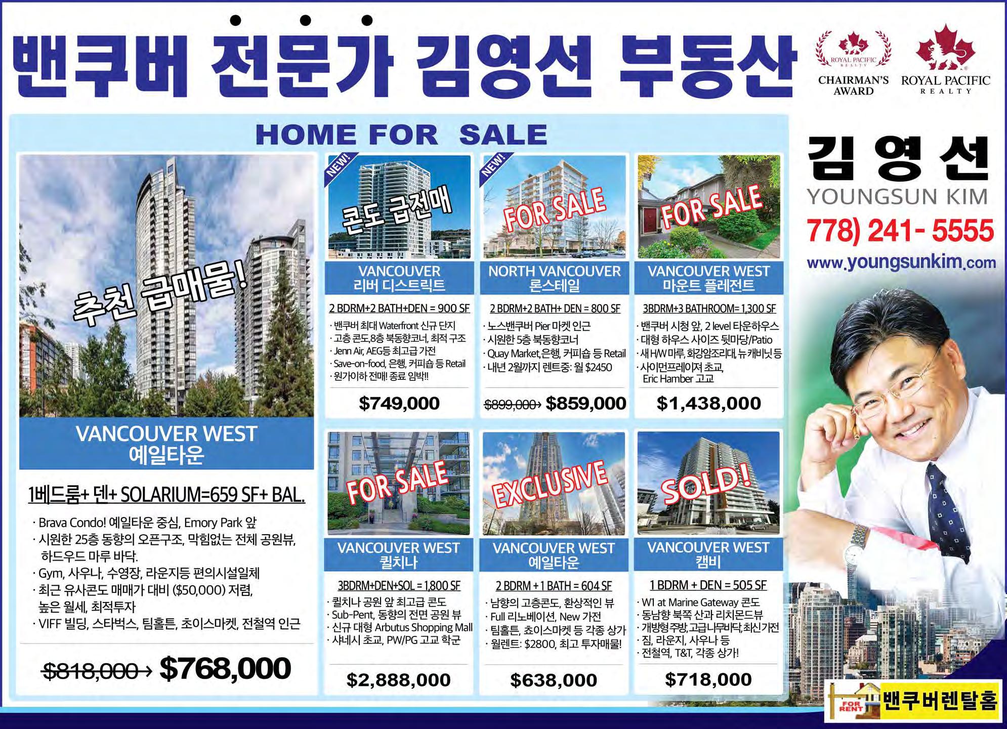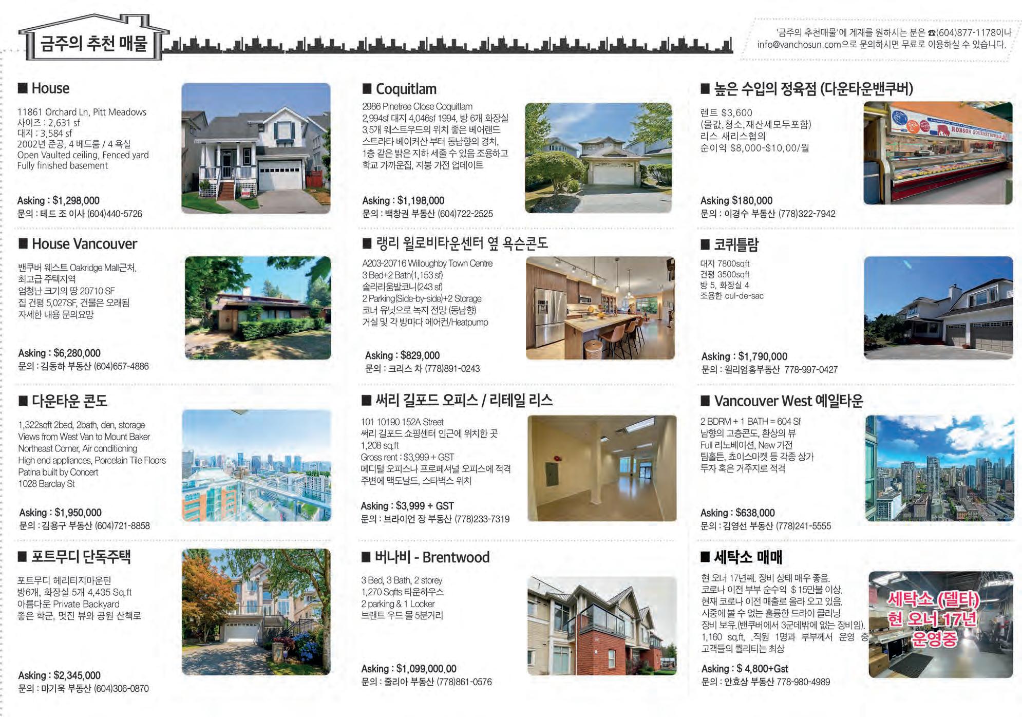 밴쿠버섬 팍스빌 $150,000 $2,500 (모두포함), 5년+5년, 8am-3pm / 일요일휴무, 주인 은퇴 화재 후 새건물, 장비, Liquor licence, Full Commercial Kitchen Shoe Repair West Vancouver $69,000 $1,911 (include all & GST), 새리스 가능, 10am-6pm/5days 60년 동일한 자리영업, 주인 은퇴 원함, 쉽게 운영, 월 3천 순익 써리 길포드 근처 아파트 Asking $368,000 3층 Riverpoint Complex 1 Bath 1 parking 713 Square Feet 주소 : 309 15150 108 Avenue Gillmore Place 버나비 길모어 전철역옆 일부할인가격분양 3개빌딩 1,500세대 2024년 가을 입주예정 1 Bedroom $712,900 부터 2 Bedroom $967,900 부터 3 bedroom $1,278,363 Pre-sold $1,317,900 부터 로히드 씨티 1차분 1,500세대 2023년부터 입주 Tower 1, 3601 3 Bed $954,900 Pre-sold 써리 23 에이커 단지 아파트 Asking $384,900 버나비 타운하우스 Asking $975,000 • 1 Bed & 1 Bath, 2 parking, 1 locker • 19+, No Rental, 765 SF • Address: 406 13860 70 Avenue • 3 Bed & 1 Bath, 1 parking • 2,226 Square Feet, 조용한 동네 • Address: 5795 Mayview Circle 버나비 전철역옆 콘도 Asking $819,000 2 Bed & 2 Bath room 1 Parking & 1 Locker Swimming Pool, 2203 2388 Madison Aven Fitness Centre SOLD SOLD 1Bedroom SOLD 1 침실, 1 화장실 en suite laundry 24시간 관리인상주 1 Locker 어린이 놀이터, 코스코 및 BC Place Stadium근처 수영장, Fitness Centre 509 스퀘어피트 밴쿠버 예일타운 콘도 Asking $770,000Offer SOLD SOLD 35yr SOLD