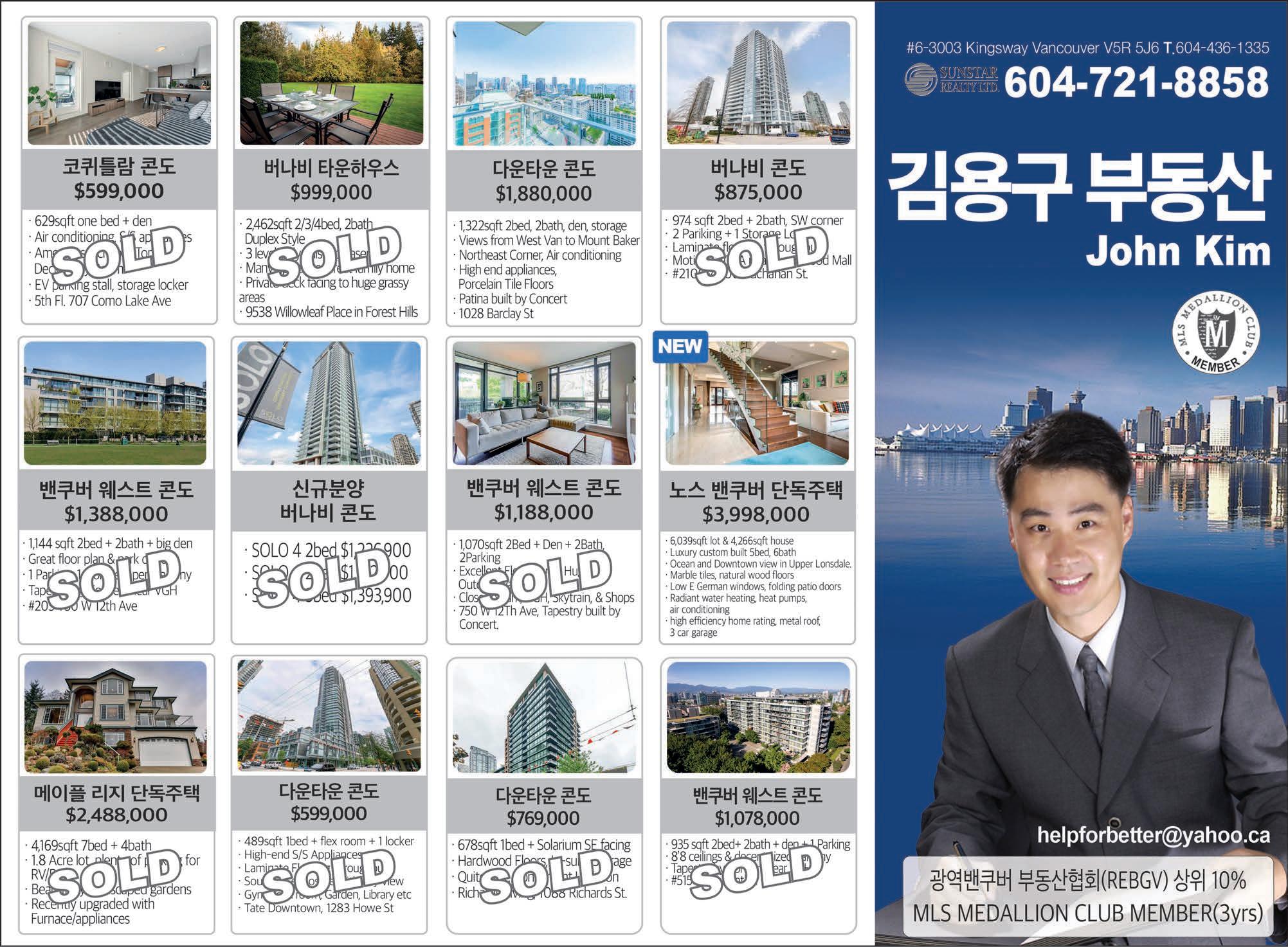 C15조선일보 Sutton Group Westcoast Realty #301-1508 W. Broadway Vancouver V6J 1W8 www.bopark.ca 박보영 부동산은 쉬지 않고 여러분들을 위해서 뜁니다. 박보영 부동산 Vancouver West 전문 Realtor “29년 경력의 전문가” Bo Park(박보영) 직통 : 604) 377-7899 Email : bo@bopark.ca ■ 전문 지역 ■ Vancouver WestㆍDowntown YaletownㆍCoal Harbour ■ 경력: 15 years+ ■ 실력: 실적 상위 0.1% (MLS FVREB) 메달리언 클럽멤버 ■ 열정: 7am-11pm 7days a week (무료상담) 철저한 전략과 분석! Smart Buying & Selling www. MrOpenHouse.ca 건축공학 및 건설관리전공 리얼터. 전문성에서 앞서갑니다! #140 4664 Lougheed Hwy Burnaby BC V5C 5T5 TEL: 604-299-9680 Sutton Group 1st West Realty 604.781.3467 rick.royal1st@gmail.com 우종훈 부동산 2015 - 2021 7년 연속 광역밴쿠버 TOP 5% REALTOR 비즈니스 매매 2015 2016 2017 2021 2018 2019 2020 사우스 써리 $2,200,000 대지 면적 6,104 sq.ft 실내면적 4,774 sq.ft 방 6개 화장실 7개 조용한 주택가 남향집 주변 좋은 학군과 공원 브랜트우드 지역 신규 분양중! 어메이징 브랜트우드 5 최고의 위치, 럭셔리 빌리지, 미래의 명품관이 입점되는 고급단지 Solo 4 고급 대형 슈퍼 Whole food, Starbucks 와 각종 편의 시설이 구비된 대형단지 Concord 오아시스 유리로 닫을수 있는 발코니 공간! 조용하고 안전한 주택가 고급단지 ★ 로히드 버퀴틀람 지역 ★ ★ 랭리 윌로비 지역 ★ Burquitlam Precidia Foxridge Home Elmwood By Marcon Hayer Town Centre 저층 콘도 분양 임박 177세대 먼저 분양 Aston Townhome 3베드부터 4베스까지 곧 분양 시작 싱글하우스, 로홈 분양중 Master Medallion Member 코퀴틀람 센트럴 $899,900 실내면적 966 sq.ft 방 3대 화장실 2개 골프장 뷰JUSTSOLD 랭리 윌로비하이츠 $629,000 실내면적 920 sq.ft 방 2개 화장실 2개 5월 입주 예정 전매 물건 파크엔라이드 5분거리JUSTSOLD 코퀴틀람 센트럴 $789,900 실내면적 863 sq.ft 방 2대 화장실 2개 퓨쳐 공원뷰, 남향JUSTSOLD 뉴 웨스트민스터 Sold Over Asking $200,000 $899,900 실내면적 1,410 sq.ft 방 3개 화장실 3개 + 덴 모던 디자인, 오픈 컨셉 5분 거리 쇼핑몰 포트 무디 $728,000 실내면적 1,012 sq.ft 방 2개 화장실 2개 + 덴 포트무디 서터브룩 빌리지 각종 편의시설 도보거리 코퀴틀람 센트럴 $3,199,000 대지 면적 6,487 sq.ft 실내 면적 5,575 sq.ft 방 7개 화장실 8개 조용한 주택가 남향집 지하 렌트스윗 뉴웨스트민스터 빅토리아 힐 $539,900 실내면적 663 sq.ft 1 베드 + 1 베스 마스터플랜 커뮤니티 Onni 개발사 랭리 윌로비하이츠 $1,169,000 실내면적 1,766 sq.ft 방 3개 화장실 3개 코너 유닛, 밝은 채광 주변의 편의 시설 및 학교 랭리 월넛그로브 $1,780,000 대지 면적 3,767 sq.ft 실내면적 3,425 sq.ft 방 5개 화장실 4개 조용한 주택가 골프장 뷰 지하 렌트스윗JUSTSOLD 랭리 월넛그로브 $1,099,000 실내면적 2,229 sq.ft 방 3개 화장실 3개 조용한 주택가 5분거리에 학교, 쇼핑, 공원JUSTSOLD 랭리 윌로비하이츠 $889,900 실내면적 1,414 sqft 방 3개 화장실 3개 유명건설사 폴리곤 단지내 헬스장, 수영장 각종 편의시설JUSTSOLD 랭리 윌로비하이츠 라티마 빌리지 $519,900 실내면적 669 sq.ft 1 베드 1베스JUSTSOLD 써리 센트럴 $489,900 실내면적 517 sq.ft 방 1개 화장실 1개 전철역 및 SFU, 시청 5분 거리JUSTSOLD JUSTSOLDJUSTSOLD JUSTSOLD 랭리 윌로비하이츠 $779,900 실내면적 1,381 sq.ft 방 3개 화장실 2개 욕슨콘도 전매 7월 입주 예정JUSTSOLD 랭리 월넛그로브 스시 레스토랑 써리 길포드 빙수가게 $248,900 플라자안에 위치 트래픽이 많음. 매상 꾸준히 증가OfferAccepted 코퀴틀람 버크마운틴 $2,500,000 대지 면적 5,230 sq.ft 실내 면적 3,314 sq.ft 방 4개 화장실 4개JUSTSOLD 7년 연속 광역 밴쿠버 TOP 5% REALTOR Master Medallion Member / 604.781.3467 / rick.royal1st@gmail.com