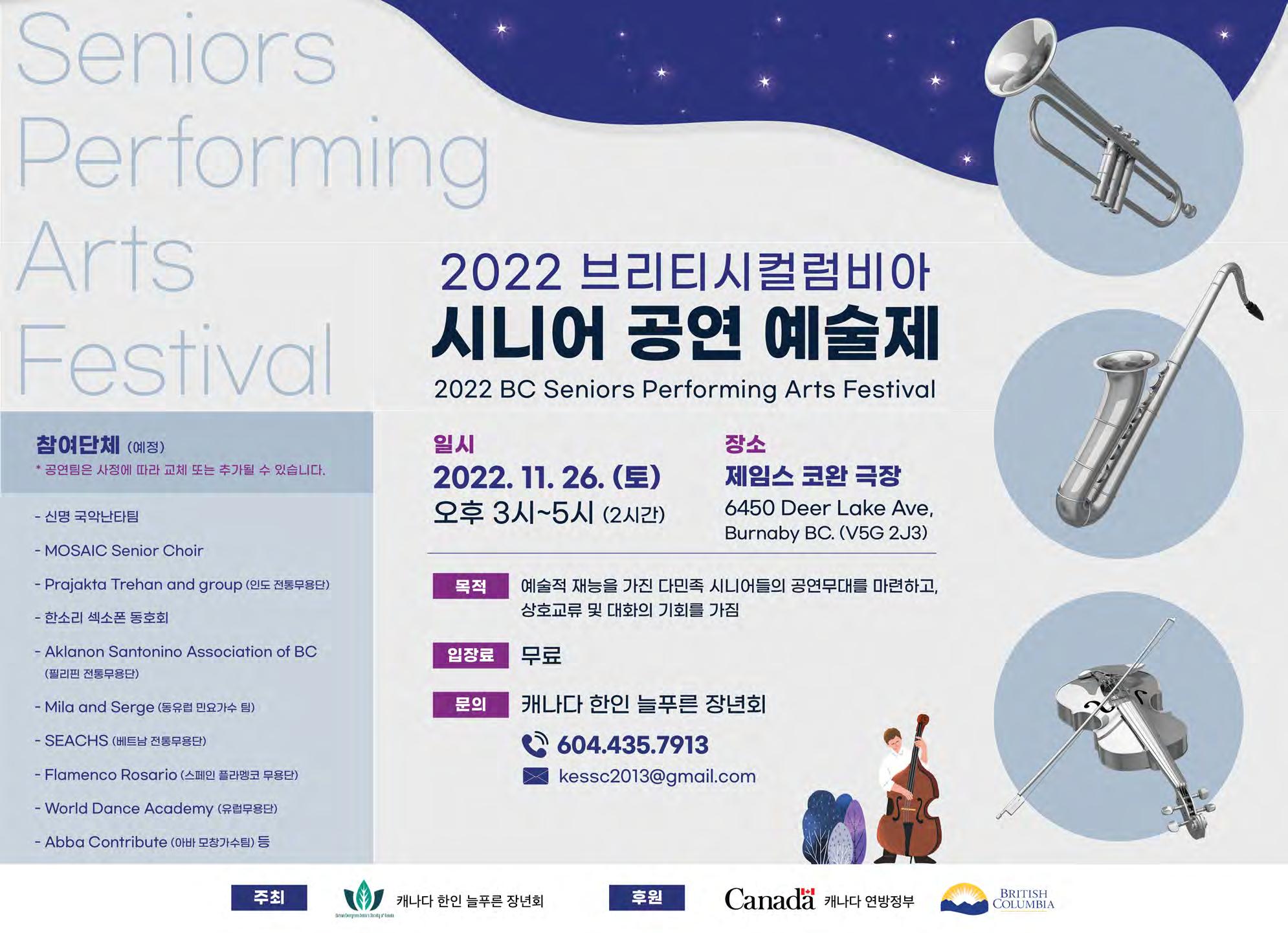 2022년 10월 28일 금요일 A15조선일보 전 면 광 고 후원 :주최 :밴쿠버 한인문화협회 KOREAN SOCIETY OF BRITISH COLUMBIA 무료입장권 문의 : 오로니아 매장(604-579-0177), 한인문화협회(604-319-7748, 778-386-8503), 한인회(604-729-8950) Nov.3&4,2022@7pm 첫날 한국 문화 갈라 공연 둘째날 국악의 향연 20 th Michael J Fox Theatre, Burnab y 출연진 : 캐나다 중앙무용단, 소리춤, 마마키쉬 K-pop 아카데미, 밴쿠버 경희대태권도 시범단, 국악의 향기