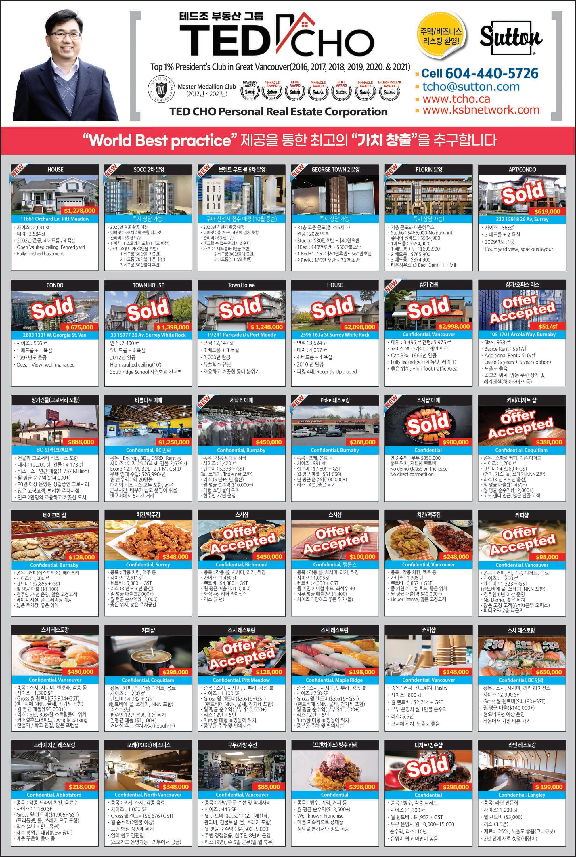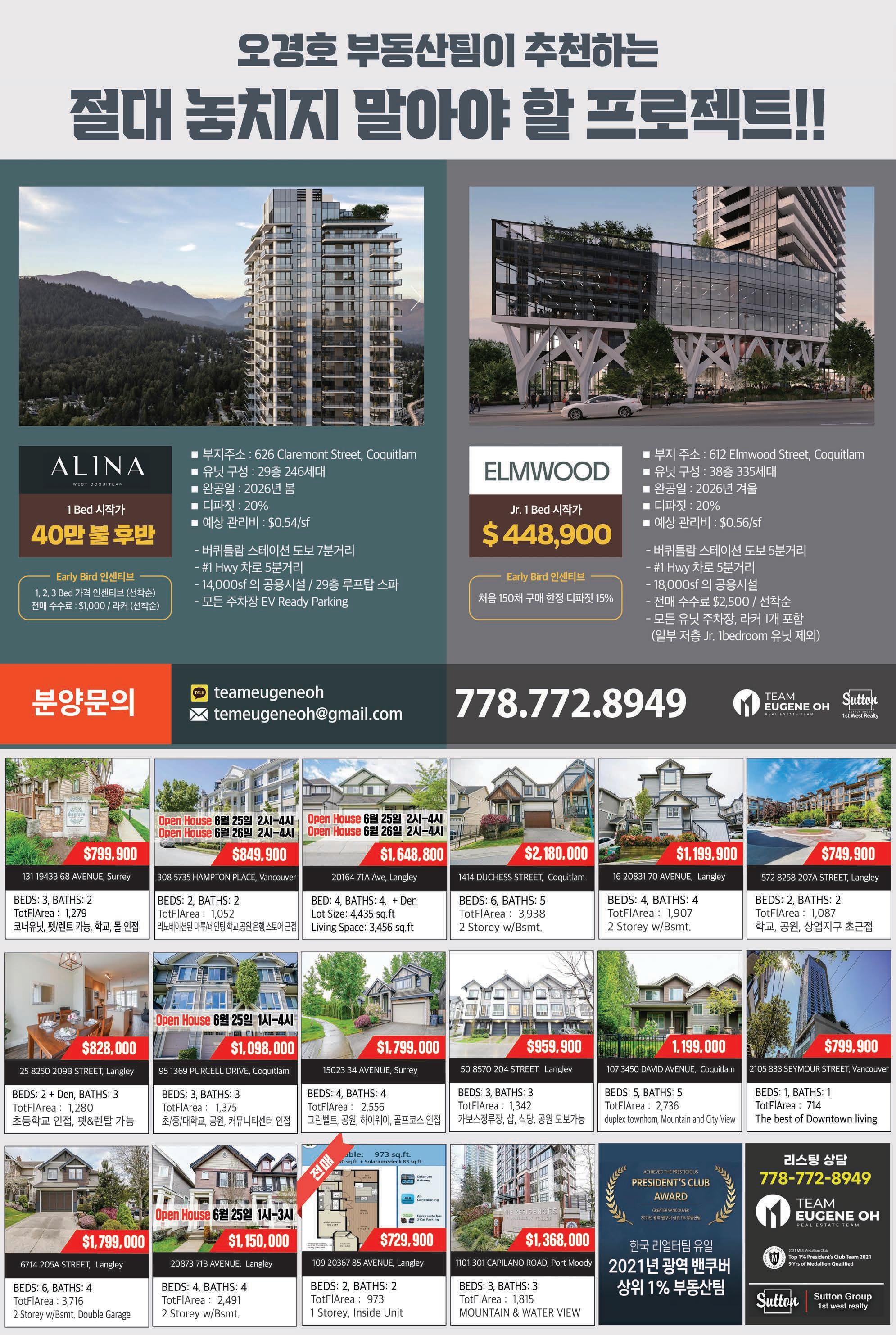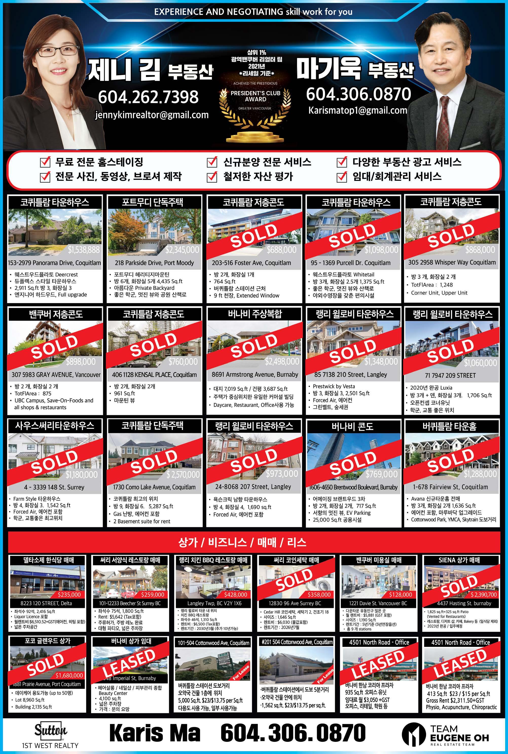 C15조선일보 Sutton Group Westcoast Realty #301-1508 W. Broadway Vancouver V6J 1W8 www.bopark.ca 박보영 부동산은 쉬지 않고 여러분들을 위해서 뜁니다. 박보영 부동산 Vancouver West 전문 Realtor “29년 경력의 전문가” Bo Park(박보영) 직통 : 604) 377-7899 Email : bo@bopark.ca ■ 전문 지역 ■ Vancouver WestㆍDowntown YaletownㆍCoal Harbour ■ 경력: 15 years+ ■ 실력: 실적 상위 0.1% (MLS FVREB) 메달리언 클럽멤버 ■ 열정: 7am-11pm 7days a week (무료상담) 철저한 전략과 분석! Smart Buying & Selling www. MrOpenHouse.ca 건축공학 및 건설관리전공 리얼터. 전문성에서 앞서갑니다! #140 4664 Lougheed Hwy Burnaby BC V5C 5T5 TEL: 604-299-9680 Sutton Group 1st West Realty 604.781.3467 rick.royal1st@gmail.com 우종훈 부동산 2015 - 2021 7년 연속 광역밴쿠버 TOP 5% REALTOR 비즈니스 매매 2015 2016 2017 2021 2018 2019 2020 사우스 써리 $2,200,000 대지 면적 6,104 sq.ft 실내면적 4,774 sq.ft 방 6개 화장실 7개 조용한 주택가 남향집 주변 좋은 학군과 공원 브랜트우드 지역 신규 분양중! 어메이징 브랜트우드 5 최고의 위치, 럭셔리 빌리지, 미래의 명품관이 입점되는 고급단지 Solo 4 고급 대형 슈퍼 Whole food, Starbucks 와 각종 편의 시설이 구비된 대형단지 Concord 오아시스 유리로 닫을수 있는 발코니 공간! 조용하고 안전한 주택가 고급단지 ★ 로히드 버퀴틀람 지역 ★ ★ 랭리 윌로비 지역 ★ Burquitlam Precidia Foxridge Home Elmwood By Marcon Hayer Town Centre 저층 콘도 분양 임박 177세대 먼저 분양 Aston Townhome 3베드부터 4베스까지 곧 분양 시작 싱글하우스, 로홈 분양중 Master Medallion Member 코퀴틀람 센트럴 $899,900 실내면적 966 sq.ft 방 3대 화장실 2개 골프장 뷰JUSTSOLD 랭리 윌로비하이츠 $629,000 실내면적 920 sq.ft 방 2개 화장실 2개 5월 입주 예정 전매 물건 파크엔라이드 5분거리JUSTSOLD 코퀴틀람 센트럴 $789,900 실내면적 863 sq.ft 방 2대 화장실 2개 퓨쳐 공원뷰, 남향JUSTSOLD 뉴 웨스트민스터 Sold Over Asking $200,000 $899,900 실내면적 1,410 sq.ft 방 3개 화장실 3개 + 덴 모던 디자인, 오픈 컨셉 5분 거리 쇼핑몰 포트 무디 $728,000 실내면적 1,012 sq.ft 방 2개 화장실 2개 + 덴 포트무디 서터브룩 빌리지 각종 편의시설 도보거리 코퀴틀람 센트럴 $3,199,000 대지 면적 6,487 sq.ft 실내 면적 5,575 sq.ft 방 7개 화장실 8개 조용한 주택가 남향집 지하 렌트스윗 뉴웨스트민스터 빅토리아 힐 $539,900 실내면적 663 sq.ft 1 베드 + 1 베스 마스터플랜 커뮤니티 Onni 개발사 랭리 윌로비하이츠 $1,169,000 실내면적 1,766 sq.ft 방 3개 화장실 3개 코너 유닛, 밝은 채광 주변의 편의 시설 및 학교 랭리 월넛그로브 $1,780,000 대지 면적 3,767 sq.ft 실내면적 3,425 sq.ft 방 5개 화장실 4개 조용한 주택가 골프장 뷰 지하 렌트스윗JUSTSOLD 랭리 월넛그로브 $1,099,000 실내면적 2,229 sq.ft 방 3개 화장실 3개 조용한 주택가 5분거리에 학교, 쇼핑, 공원JUSTSOLD 랭리 윌로비하이츠 $889,900 실내면적 1,414 sqft 방 3개 화장실 3개 유명건설사 폴리곤 단지내 헬스장, 수영장 각종 편의시설JUSTSOLD 랭리 윌로비하이츠 라티마 빌리지 $519,900 실내면적 669 sq.ft 1 베드 1베스JUSTSOLD 써리 센트럴 $489,900 실내면적 517 sq.ft 방 1개 화장실 1개 전철역 및 SFU, 시청 5분 거리JUSTSOLD JUSTSOLDJUSTSOLD JUSTSOLD 랭리 윌로비하이츠 $779,900 실내면적 1,381 sq.ft 방 3개 화장실 2개 욕슨콘도 전매 7월 입주 예정JUSTSOLD 랭리 월넛그로브 스시 레스토랑 써리 길포드 빙수가게 $248,900 플라자안에 위치 트래픽이 많음. 매상 꾸준히 증가OfferAccepted 코퀴틀람 버크마운틴 $2,500,000 대지 면적 5,230 sq.ft 실내 면적 3,314 sq.ft 방 4개 화장실 4개JUSTSOLD 7년 연속 광역 밴쿠버 TOP 5% REALTOR Master Medallion Member / 604.781.3467 / rick.royal1st@gmail.com
