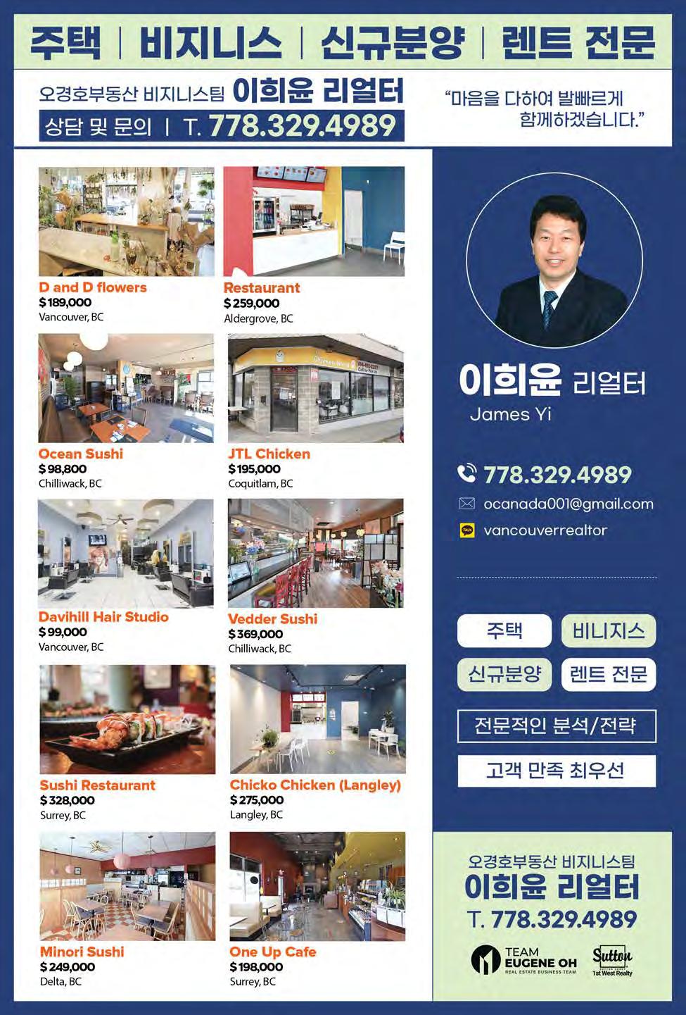 2022년 10월 29일 토요일 C11조선일보 Errors & Omissions - The information contained here in is from the owners of the businesses, therefore nowarranties or representations expressed or implied aremade to the accuracy and liability of their businesses.2629 Kingsway, Vancouver B.C. Selmak Realty Ltd. 778-322-7942 이경수 공인중개사Bond Lee Suchi Take Out North Vancouver $160,000 $3,275(include all & GST), September 2026,11-8/7 Days Owner Retiring , Liquire Licence , One owner with employee 운영 쉬운 복권 및 편의점 Vancouver