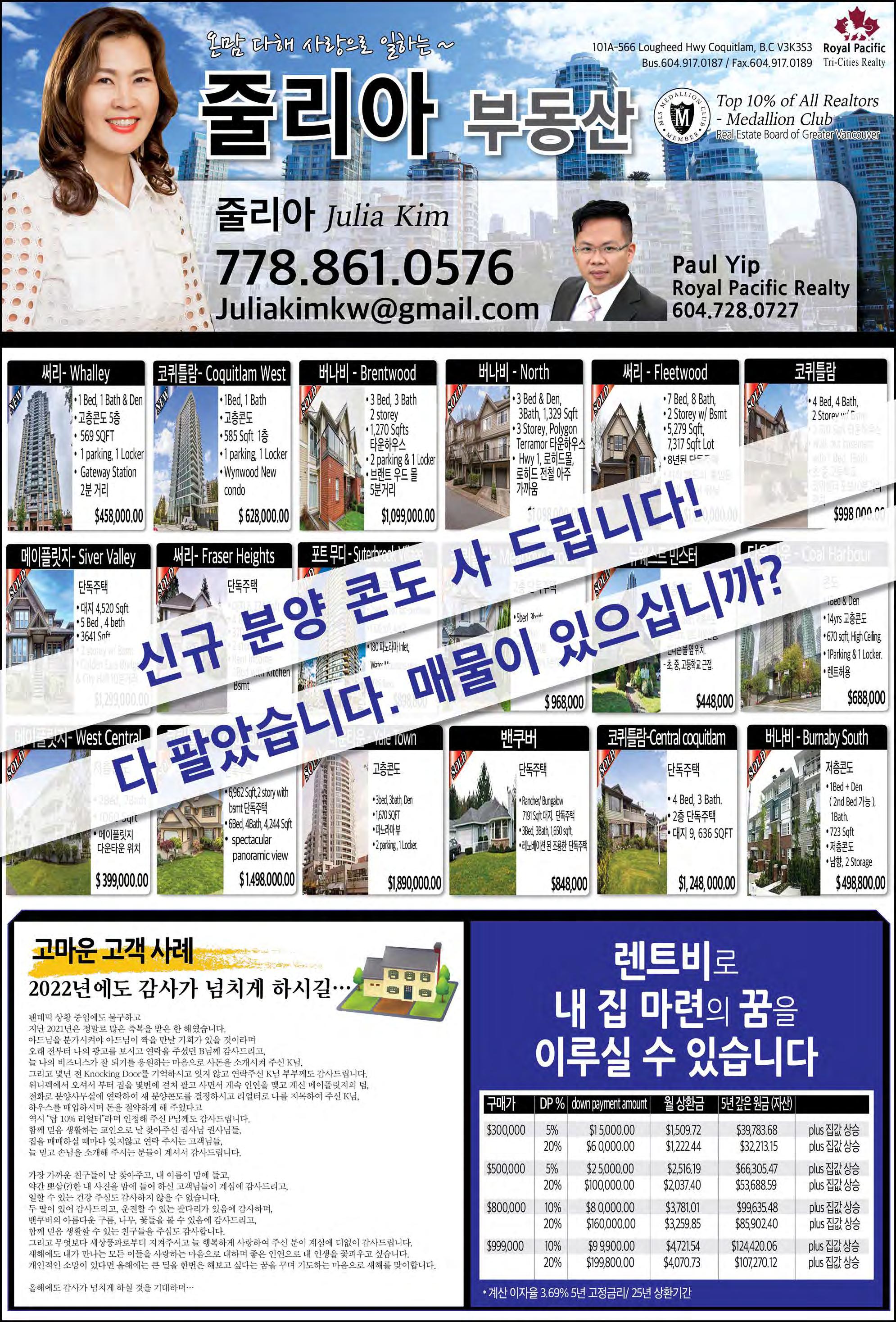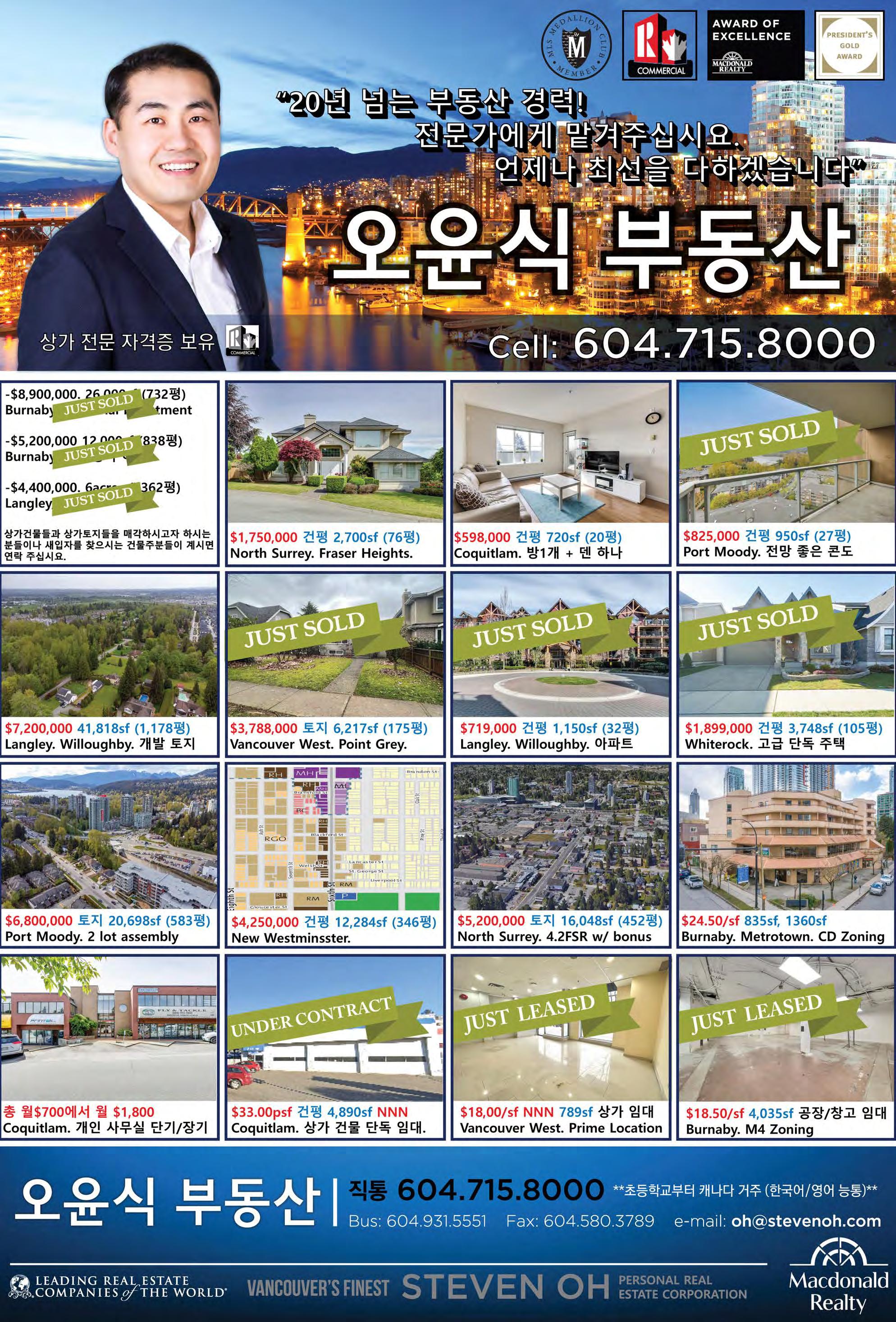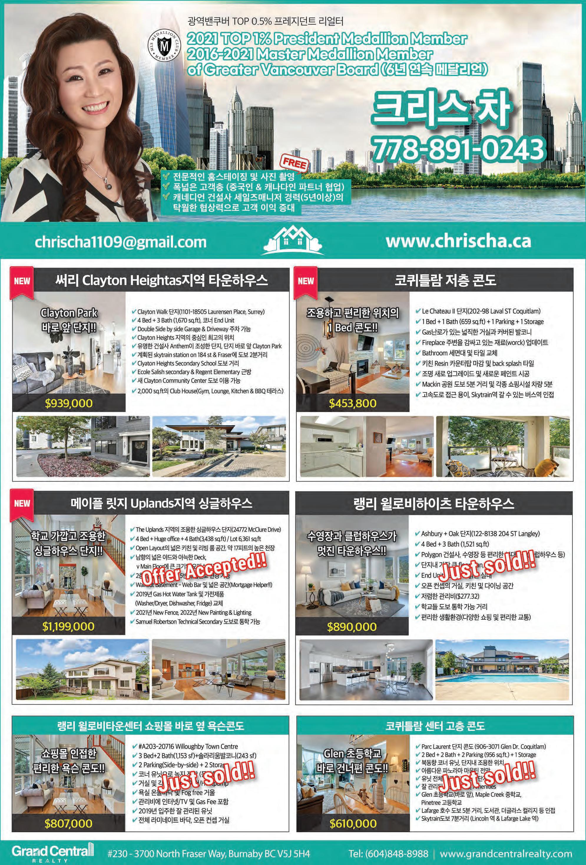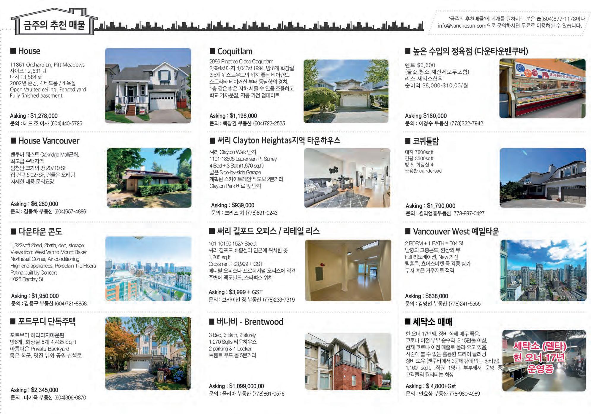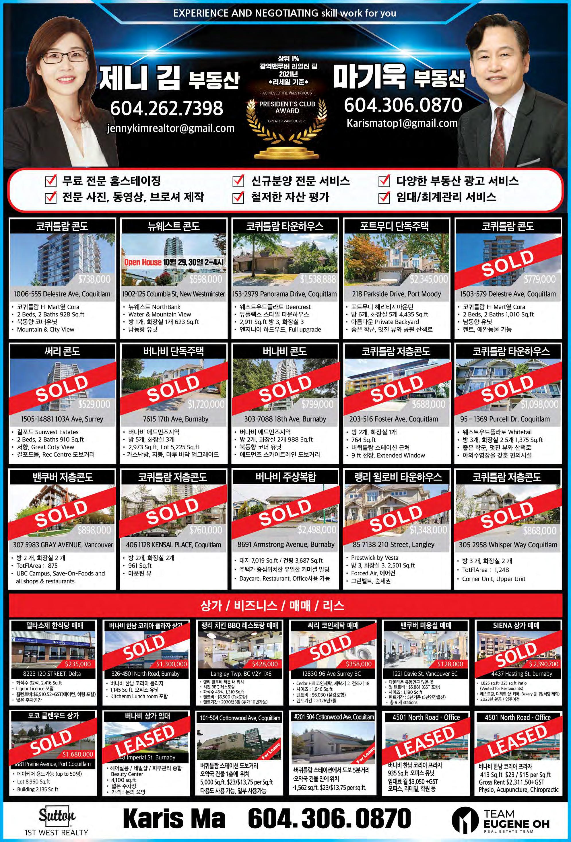 2022년 10월 29일 토요일C10 조선일보 건축공학 및 건설관리전공 리얼터. 전문성에서 앞서갑니다! #140 4664 Lougheed Hwy Burnaby BC V5C 5T5 TEL: 604-299-9680 Sutton Group 1st West Realty 604.781.3467 rick.royal1st@gmail.com 우종훈 부동산 2015 - 2021 7년 연속 광역밴쿠버 TOP 5% REALTOR 비즈니스 매매 2015 2016 2017 2021 2018 2019 2020 사우스 써리 $2,200,000 대지 면적 6,104 sq.ft 실내면적 4,774 sq.ft 방 6개 화장실 7개 조용한 주택가 남향집 주변 좋은 학군과 공원 브랜트우드 지역 신규 분양중! 어메이징 브랜트우드 5 최고의 위치, 럭셔리 빌리지, 미래의 명품관이 입점되는 고급단지 Solo 4 고급 대형 슈퍼 Whole food, Starbucks 와 각종 편의 시설이 구비된 대형단지 Concord 오아시스 유리로 닫을수 있는 발코니 공간! 조용하고 안전한 주택가 고급단지 ★ 로히드 버퀴틀람 지역 ★ ★ 랭리 윌로비 지역 ★ Burquitlam Precidia Foxridge Home Elmwood By Marcon Hayer Town Centre 저층 콘도 분양 임박 177세대 먼저 분양 Aston Townhome 3베드부터 4베스까지 곧 분양 시작 싱글하우스, 로홈 분양중 Master Medallion Member 코퀴틀람 센트럴 $899,900 실내면적 966 sq.ft 방 3대 화장실 2개 골프장 뷰JUSTSOLD 랭리 윌로비하이츠 $629,000 실내면적 920 sq.ft 방 2개 화장실 2개 5월 입주 예정 전매 물건 파크엔라이드 5분거리JUSTSOLD 코퀴틀람 센트럴 $789,900 실내면적 863 sq.ft 방 2대 화장실 2개 퓨쳐 공원뷰, 남향JUSTSOLD 뉴 웨스트민스터 Sold Over Asking $200,000 $899,900 실내면적 1,410 sq.ft 방 3개 화장실 3개 + 덴 모던 디자인, 오픈 컨셉 5분 거리 쇼핑몰 포트 무디 $728,000 실내면적 1,012 sq.ft 방 2개 화장실 2개 + 덴 포트무디 서터브룩 빌리지 각종 편의시설 도보거리 코퀴틀람 센트럴 $3,199,000 대지 면적 6,487 sq.ft 실내 면적 5,575 sq.ft 방 7개 화장실 8개 조용한 주택가 남향집 지하 렌트스윗 뉴웨스트민스터 빅토리아 힐 $539,900 실내면적 663 sq.ft 1 베드 + 1 베스 마스터플랜 커뮤니티 Onni 개발사 랭리 윌로비하이츠 $1,169,000 실내면적 1,766 sq.ft 방 3개 화장실 3개 코너 유닛, 밝은 채광 주변의 편의 시설 및 학교 랭리 월넛그로브 $1,780,000 대지 면적 3,767 sq.ft 실내면적 3,425 sq.ft 방 5개 화장실 4개 조용한 주택가 골프장 뷰 지하 렌트스윗JUSTSOLD 랭리 월넛그로브 $1,099,000 실내면적 2,229 sq.ft 방 3개 화장실 3개 조용한 주택가 5분거리에 학교, 쇼핑, 공원JUSTSOLD 랭리 윌로비하이츠 $889,900 실내면적 1,414 sqft 방 3개 화장실 3개 유명건설사 폴리곤 단지내 헬스장, 수영장 각종 편의시설JUSTSOLD 랭리 윌로비하이츠 라티마 빌리지 $519,900 실내면적 669 sq.ft 1 베드 1베스JUSTSOLD 써리 센트럴 $489,900 실내면적 517 sq.ft 방 1개 화장실 1개 전철역 및 SFU, 시청 5분 거리JUSTSOLD JUSTSOLDJUSTSOLD JUSTSOLD 랭리 윌로비하이츠 $779,900 실내면적 1,381 sq.ft 방 3개 화장실 2개 욕슨콘도 전매 7월 입주 예정JUSTSOLD 랭리 월넛그로브 스시 레스토랑 써리 길포드 빙수가게 $248,900 플라자안에 위치 트래픽이 많음. 매상 꾸준히 증가OfferAccepted 코퀴틀람 버크마운틴 $2,500,000 대지 면적 5,230 sq.ft 실내 면적 3,314 sq.ft 방 4개 화장실 4개JUSTSOLD 7년 연속 광역 밴쿠버 TOP 5% REALTOR Master Medallion Member / 604.781.3467 / rick.royal1st@gmail.com