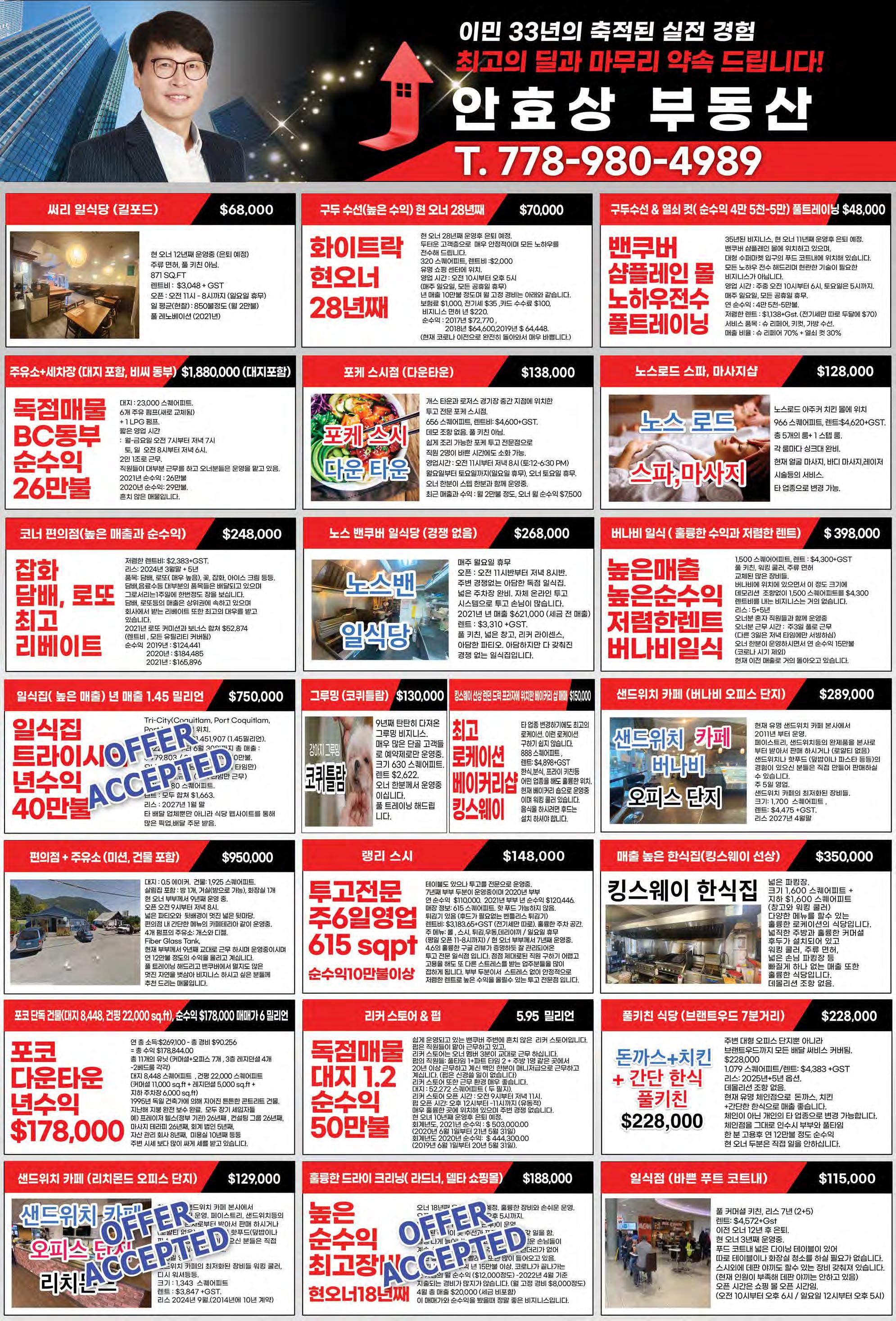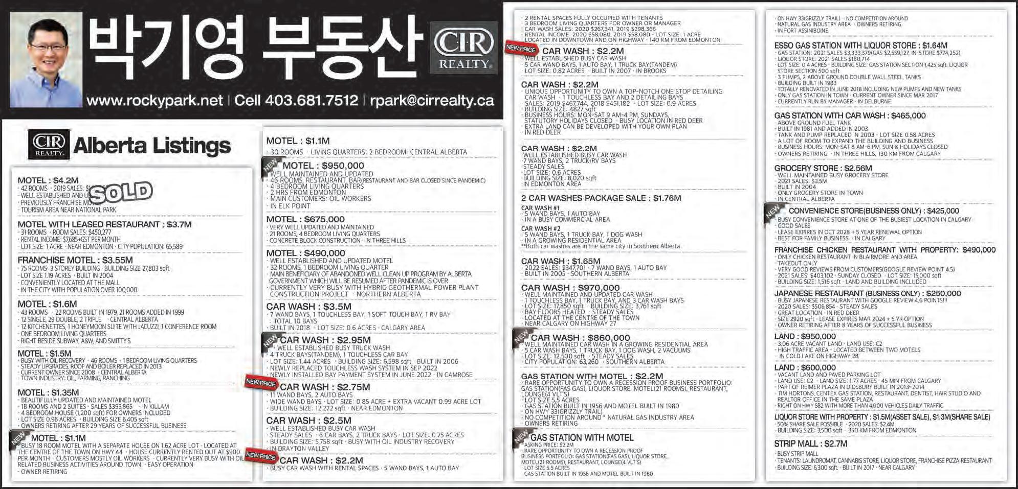 2022년 10월 29일 토요일C12 조선일보 Sutton Group Westcoast Realty #301-1508 W. Broadway Vancouver V6J 1W8 www.bopark.ca 박보영 부동산은 쉬지 않고 여러분들을 위해서 뜁니다. 박보영 부동산 Vancouver West 전문 Realtor “29년 경력의 전문가” Bo Park(박보영) 직통 : 604) 377-7899 Email : bo@bopark.ca ■ 전문 지역 ■ Vancouver WestㆍDowntown YaletownㆍCoal Harbour 이태종 (TJ Lee) www.tjlee.ca 4 Residential Properties 4 Acreage Homes 4 Business 4 Commercial Properties MISSION/ABBOTSFORD 지역 #360 - 3033 Immel St, Abbotsford, BC V2S 6S2 ● Cell : 604-302-8216 ● Office : 604-859-3141 ● email : taijonglee@shaw.ca HomeLife Advantage Realty (Central Valley) Ltd. $229,900 Brunch Cafe (Mission) · MLS# C8040357 · 미션 Local 고객들로 아주 바쁜 서양식당 · 단독건물, 실내 38석, Covered Patio 30석 · Open 7am - 3pm (Wed. closed) · 현재 월매상 4만불이상 · Monthly gross rent $2,907+gst Restaurant Lease Opportunity 아보츠포드 지역 · 단독건물, Floor Area 2,200 sqft, 대지 17,921 sqft (넓은 주차장) · Cafe로 오랫동안 운영되었던 식당 · Commercial kitchen, 10 ft hood, 60-70석 · 첫 두달 렌트 free. 세째달 렌트 $3,000 (재산세 및 GST포함)이며 매달 $100씩 인상하여 $5,000에서 고정. · 18개월 운영후 Business Assets (장비 및 인테리어) 10만불에 인수가능 $459,900 (Mission) 아파트 · 15년 된 869 sqft 1Bed 1Bath Condo · 미션에서 가장 좋은 위치에 있으며 가장 고급으로 잘 지어진 아파트임. · 단지가 Heritage Park와 면해있어 단지밖만 나가면 바로 공원이라 산책하며 Fraser River와 Valley view를 즐길수 있음. · 3층 건물 2동이고 총 70세대인 Gated complex Full Service Hotel (AB) · Asking: $7.5M · 68 Rooms + 13 Units의 별도 건물 Suites · 꾸준한 $1M 이상의 Room Sales · 10 VLTs와 Tavern, Lounge, Liquor Store · Near Big City High Volume Gas Station + Car Wash (2 Bays) (BC) · Asking: $5.35M · 주변 관광지 많은 B.C. Town · 꾸준한 매출, 안정적인 수익 · 2022 FY Gross Sales; $7.6M Gas Station + Liquor Store + Living Quarter · Asking: $3.9M · Fort McMurray Area · 급속히 회복되는 매출 · 2022 FY Gross Margin Over $1Mil 예상 Convenience Store + Liquor Store (SK) · Asking: $735,000 · Gross Sales 1.3M · Sales 계속 상승중, 올해 매출 $1.6M 예상 · Renovated Commercial Kitchen, 2 Bedroom Living Quarter Gas Station + Car Wash(3 Bay) (AB) · Asking:$1.99M · Near Edmonton · New Pumps & Gas Storage Tanks (Double Walled Fibre Glass) · Gas($2M), Store($1.2M), Car Wash($70,000) 진병원·모니카 진 부동산 BC, AB, SK주 Licensed Realtor Western Canada 모든 지역의 매물 상담 가능합니다. 403-554-9784 bbwjin@shaw.ca monicajin@shaw.ca westerncommercialproperties.ca MaxWell Capital Realty(Calgary), Re/Max Bridge City Realty(Saskatoon) NEW NEW NEW NEW Gas Station + Car Wash(6 Bays) (SK) · Asking: $5.85M · 매년 크게 오르는 매출 · SK주 대도시 · 2016년 Renovation과 새로 건축한 Property · NOI(Net Operating Income) Over $1M Gas Station + 21 Unit Lodge + 2 Bays Food Court (SK) · Asking: $6.9M · 매출 올라가고 있는 가능성 많은 사업체 · 독립 건물 형태의 21 Unit의 Lodge와 Recreation Center · !4 Acre의 넓은 땅 · Seller Financing 가능 Franchise Motel on Busy HWY(AB) · Asking:$4.9M · 81 Rooms · 7 Acres의 넓은 땅 · Well Built & Well Kept Building · 지난 1년 Room Sales $1.5M Gas Station + Leased Liquor Store (AB) · Asking:$2.95M · Near Calgary(40 Minutes) · 교통량 많은 도로 선상 · 안정적인 Rental Income과 잘 관리된 Property · Gross Margin; $580,000 Motel + Strip Mall(7 Bays) (AB) · Asking: $4.99M · Alberta 대도시의 Good Location · Renovation 잘 된 78 Room Motel · 꾸준한 Rental Income과 상승중인 Room Sales · 2 Bedroom의 Living Quarter NEW NEW NEW NEW NEW C/S C/S