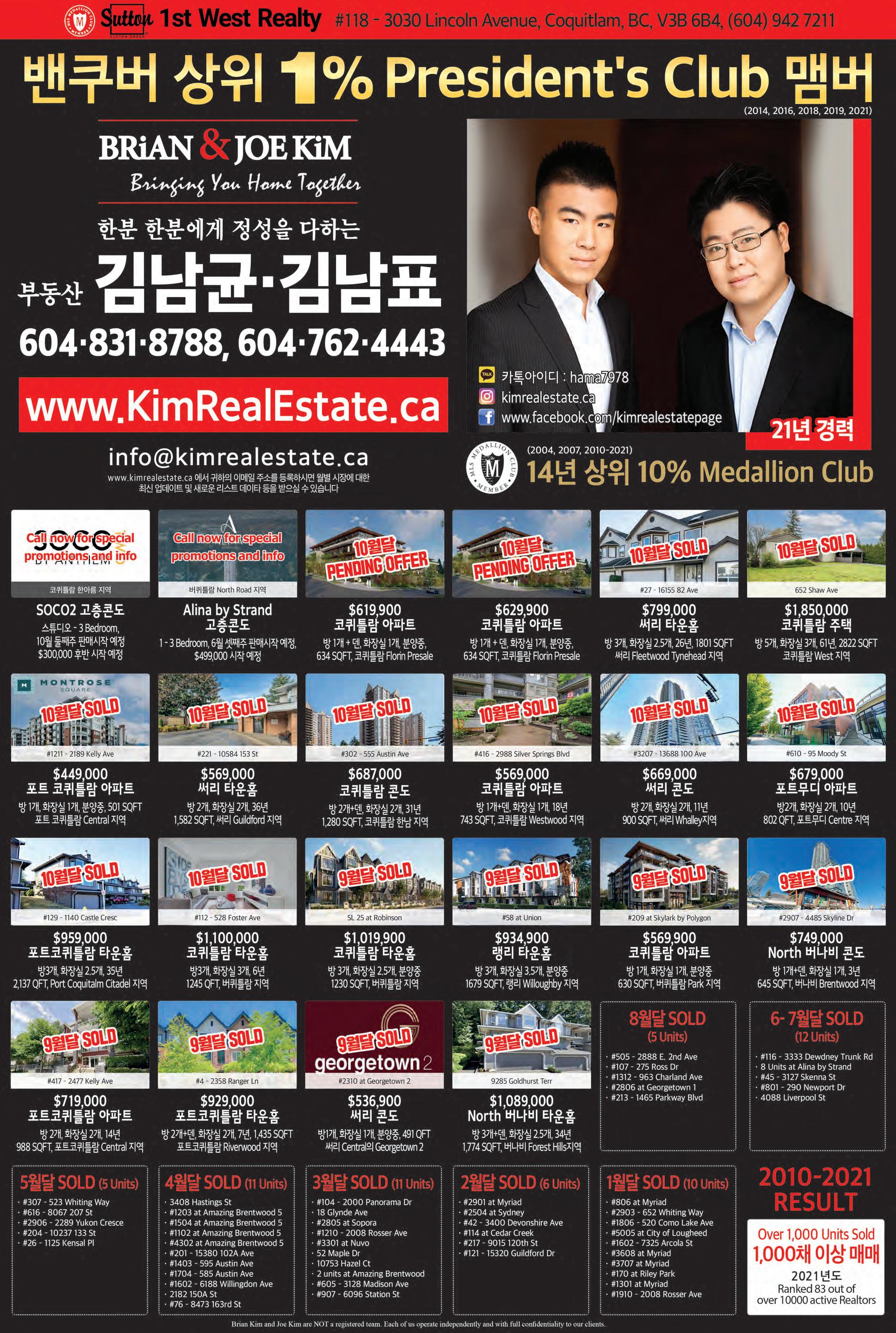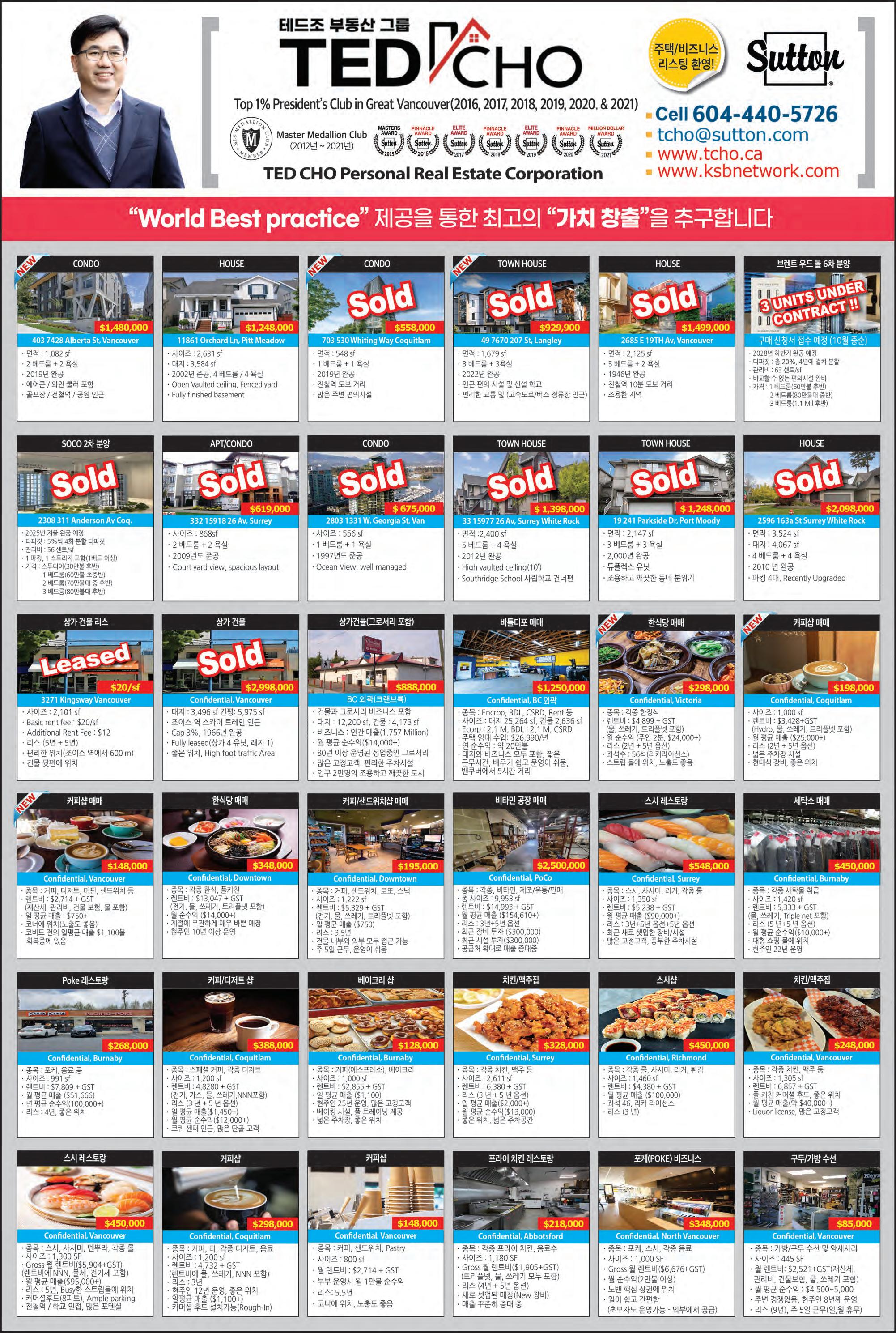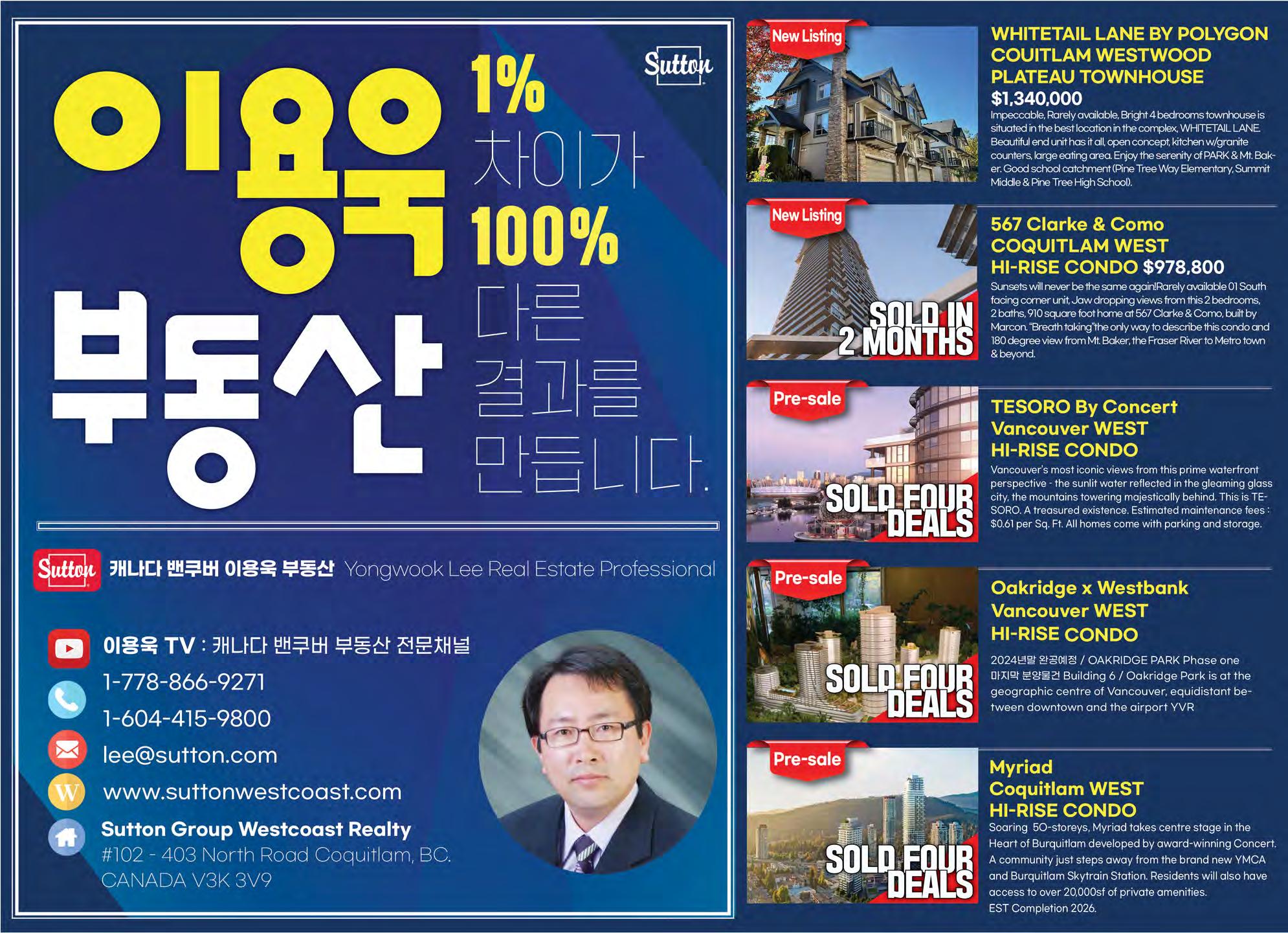 C16 조선일보 Sutton Group Westcoast Realty #301-1508 W. Broadway Vancouver V6J 1W8 www.bopark.ca 박보영 부동산은 쉬지 않고 여러분들을 위해서 뜁니다. 박보영 부동산 Vancouver West 전문 Realtor “29년 경력의 전문가” Bo Park(박보영) 직통 : 604) 377-7899 Email : bo@bopark.ca ■ 전문 지역 ■ Vancouver WestㆍDowntown YaletownㆍCoal Harbour ■ 경력: 15 years+ ■ 실력: 실적 상위 0.1% (MLS FVREB) 메달리언 클럽멤버 ■ 열정: 7am-11pm 7days a week (무료상담) 철저한 전략과 분석! Smart Buying & Selling www. MrOpenHouse.ca 건축공학 및 건설관리전공 리얼터. 전문성에서 앞서갑니다! #140 4664 Lougheed Hwy Burnaby BC V5C 5T5 TEL: 604-299-9680 Sutton Group 1st West Realty 604.781.3467 rick.royal1st@gmail.com 우종훈 부동산 2015 - 2021 7년 연속 광역밴쿠버 TOP 5% REALTOR 비즈니스 매매 2015 2016 2017 2021 2018 2019 2020 사우스 써리 $2,200,000 대지 면적 6,104 sq.ft 실내면적 4,774 sq.ft 방 6개 화장실 7개 조용한 주택가 남향집 주변 좋은 학군과 공원 브랜트우드 지역 신규 분양중! 어메이징 브랜트우드 5 지 이 는 지 Solo 4 이 된 지 Concord 오아시스 는 하 한 지 ★ 로히드 버퀴틀람 지역 ★ ★ 랭리 윌로비 지역 ★ Burquitlam Precidia Foxridge Home Hayer Town Centre 분양 세 분양 Aston Townhome 스 지 분양 하 스 분양중