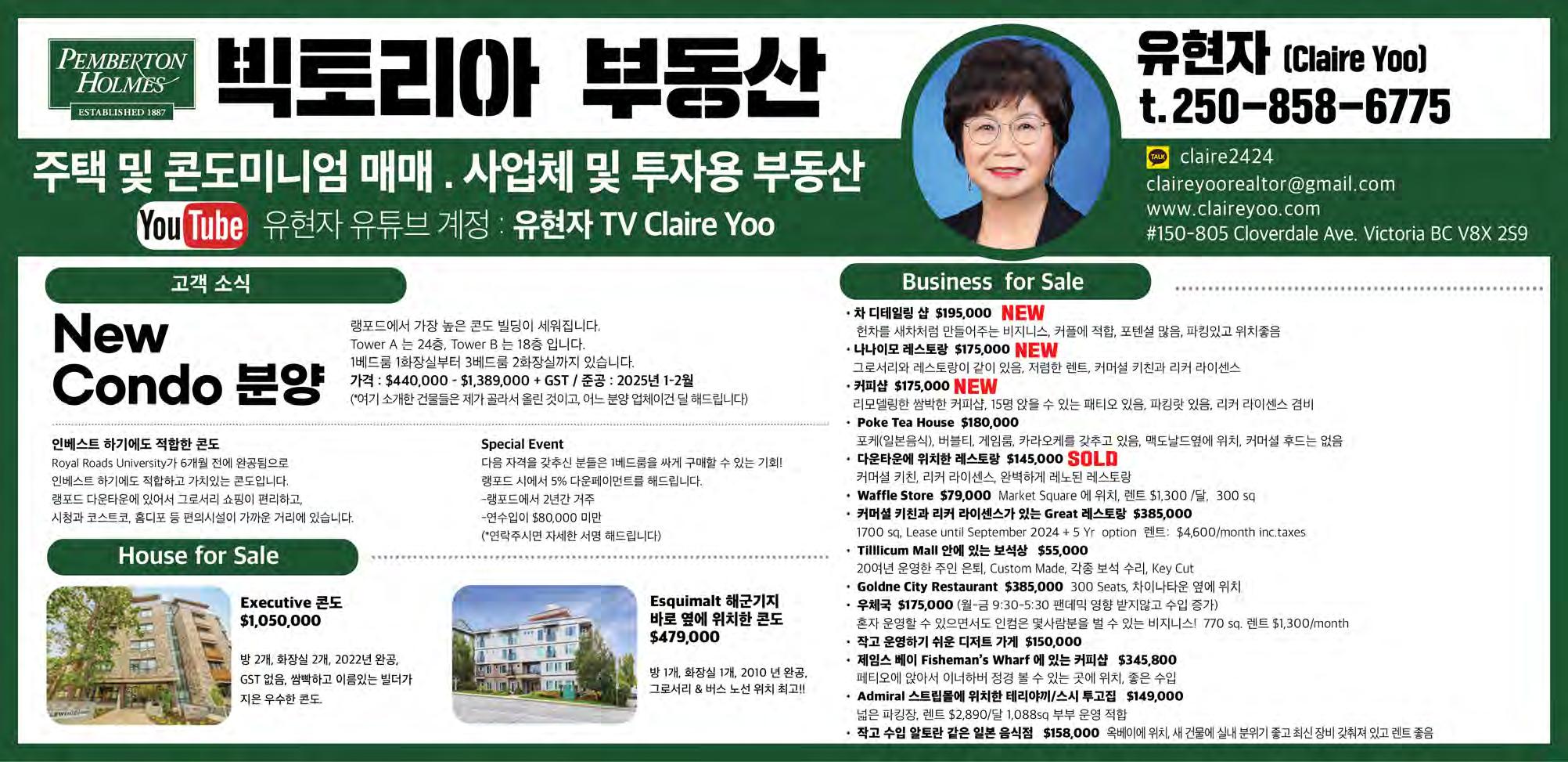 동일한 자리영업, 주인 은퇴 원함, 쉽게 운영, 월 3천 순익 써리 길포드 근처 아파트 Asking $368,000 3층 Riverpoint Complex 1 Bath 1 parking 713 Square Feet 주소 : 309 15150 108 Avenue Gillmore Place 버나비 길모어 전철역옆 일부할인가격분양 3개빌딩 1,500세대 2024년 가을 입주예정 1 Bedroom $712,900 부터 2 Bedroom $967,900 부터 3 bedroom $1,278,363 Pre-sold $1,317,900 부터 로히드 씨티 1차분 1,500세대 2023년부터 입주 Tower 1, 3601 3 Bed $954,900 Pre-sold 버나비 전철역옆 콘도 Asking $819,000 2 Bed & 2 Bath room 1 Parking & 1 Locker Swimming Pool, 2203 2388 Madison Aven Fitness Centre SOLD 1Bedroom SOLD 3배드룸, 2화장실, 2 주차장 2층, 1,430스퀘어피트 13289 71B Avenue 초,중등학교 및 코스코근처 편리한 위치 2092년까지 리스 건물 : 3,237스퀘어피트 대지 : 6,100스퀘어피트 4 침실, 4 화장실, 6 주차장 주소 : 12132 Irving Street 써리 리스홀드 타운하우스 Asking $348,000 메이플 리지 하우스 34년 된 조용한 동네 아담한 집 Asking $1,225,000 LEASED 버나비 타운하우스 Asking $975,000 •3 Bed & 1 Bath, 1 parking •2,226 Square Feet, 조용한 동네 •Address: 5795 Mayview Circle Offer SOLD SOLD SOLD •회사명 : Building Legacy Management •연락처 : 778-386-5708 (James Lee) 오랜경력의 Red Seal Carpenter •이메일 : Atyourservice8282@gmail.com 주택리노베이션 협력업체