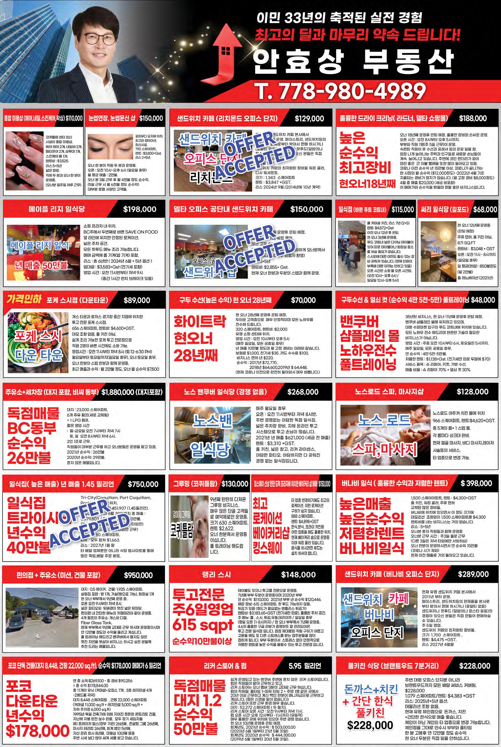 2,200SF, 월렌트 $3,000(재산세포함), 1베드룸, Full Kitchen 20개 주차장,$20,000 보증금, 초등학교 및 공원 옆, 농장주변 표구점 $280,000/2021 North Vancouver $98,000 $2,803(all)+GST, New5yr+5yr,10-5:30, 10-5/Sar,SunClose