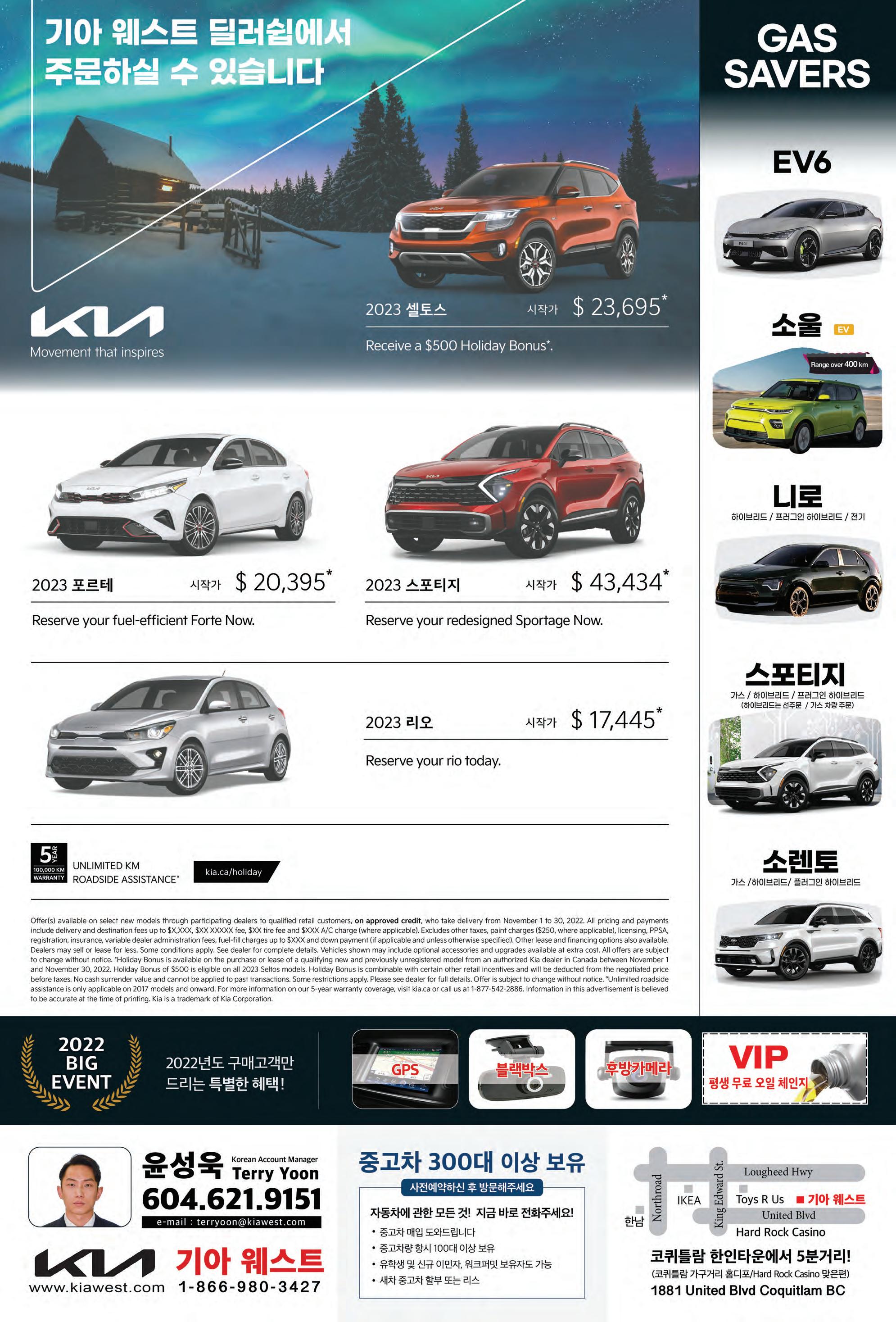 시 종업원 없이 여유있게 운영 가능. * 유틸리티, 재산세.....등등 각종 비용공제 후 월 $10,000-$11,000 net income * Asking price $42만 (재고 별도, 흥정 가능, 은행융자 가능) * 문의 : 780-999-8837 (Mr. Lee) 220316** OK 운송 1종 운전면허 소지 주정부 인가 업체 장거리 이사 전문(5톤) NSC 보유 778-988-2424 0000** (2006년 창립) 보다 좋은 서비스를 위해 사전예약 부탁 드립니다. Office 604-461-0633 Cell 604-787-7333 2400 Barnet Hwy. Port Moody 오늘 혼다 Winnie를 방문하셔서 확인해보세요 이진아 를 위한 최고의 선택 Winnie Lee 지금타고 계시는 차량을 가지고 오셔서 Honda 차량과 Trade하세요! 리스전문 2023 Full-Changed 하이브리드 완전히 새로워진 기능과 디자인 지금 오더 가능합니다 사전예약 604-787-7333 UPGRADE Future Vehicle NEW