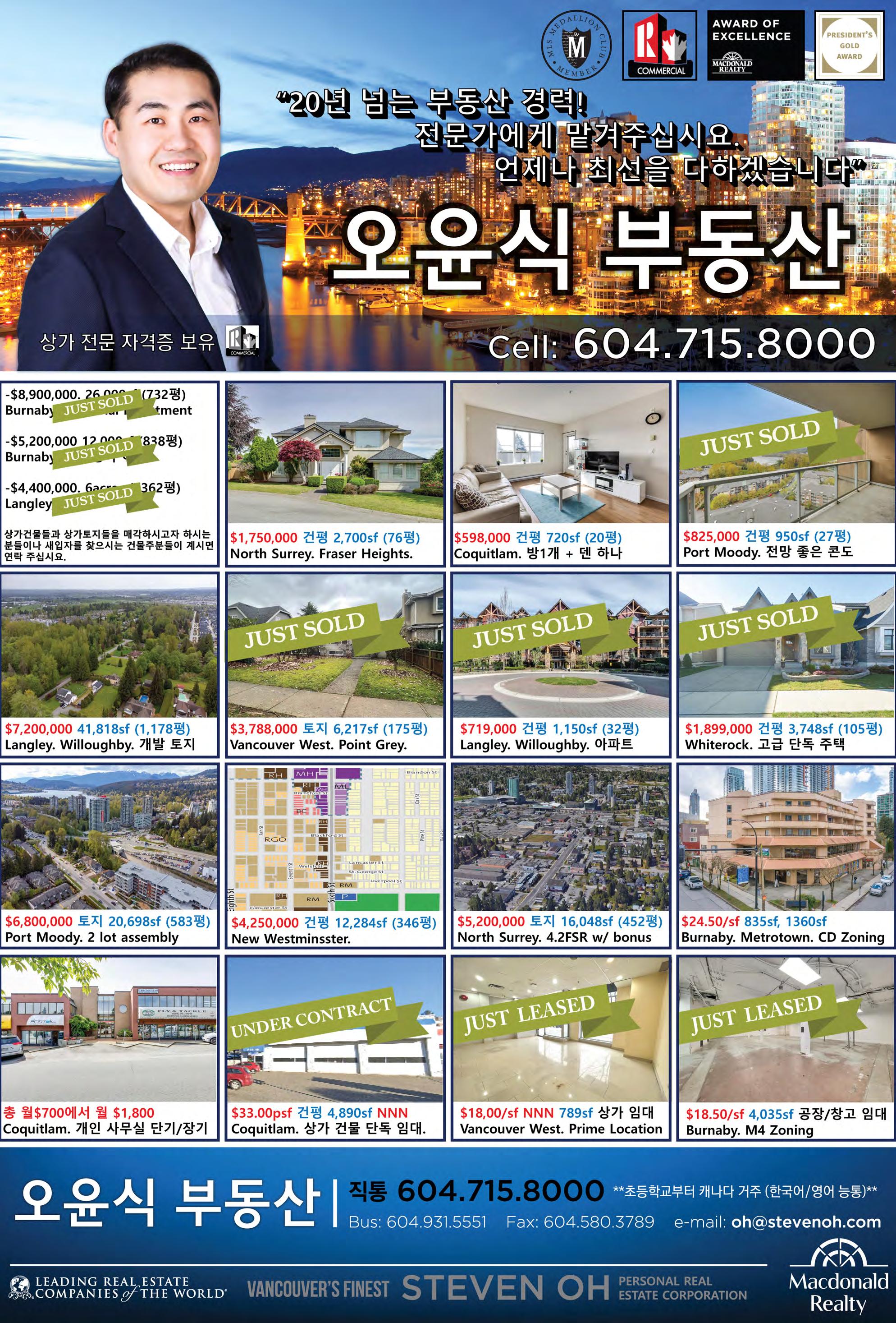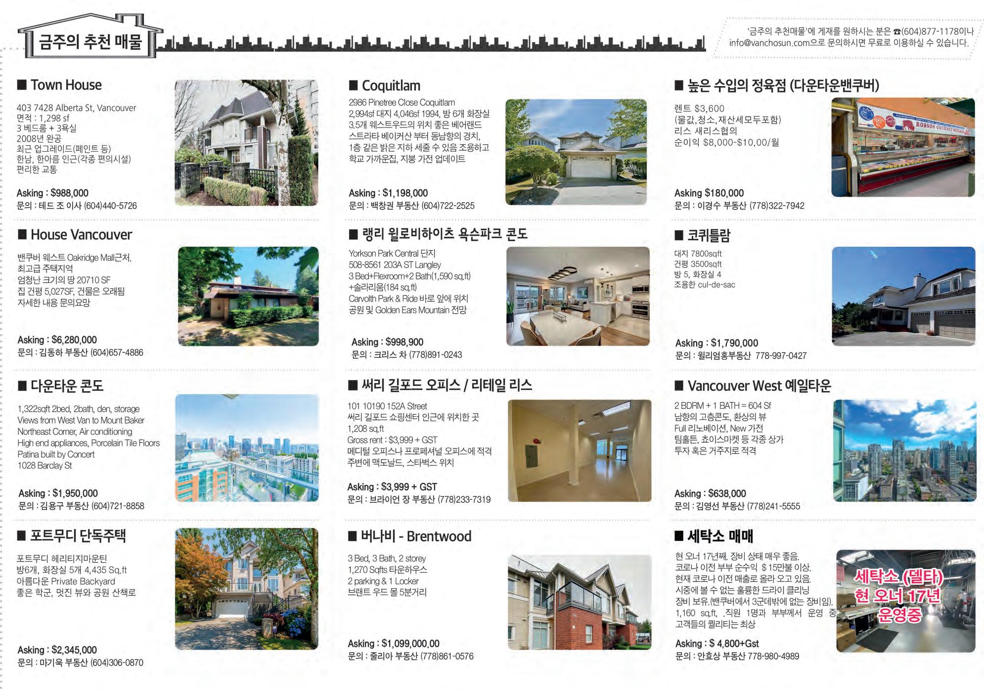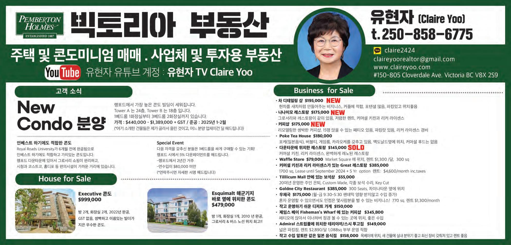 주인 은퇴 원함, 쉽게 운영, 월 3천 순익 써리 길포드 근처 아파트 Asking $368,000 3층 Riverpoint Complex 1 Bath 1 parking 713 Square Feet 주소 : 309 15150 108 Avenue Gillmore Place 버나비 길모어 전철역옆 일부할인가격분양 3개빌딩 1,500세대 2024년 가을 입주예정 1 Bedroom $712,900 부터 2 Bedroom $967,900 부터 3 bedroom $1,278,363 Pre-sold $1,317,900 부터 로히드 씨티 1차분 1,500세대 2023년부터 입주 Tower 1, 3601 3 Bed $954,900 Pre-sold 버나비 전철역옆 콘도 Asking $819,000 2 Bed & 2 Bath room 1 Parking & 1 Locker Swimming Pool, 2203 2388 Madison Aven Fitness Centre SOLD 1Bedroom SOLD 3배드룸, 2화장실, 2 주차장 2층, 1,430스퀘어피트 13289 71B Avenue 초,중등학교 및 코스코근처 편리한 위치 2092년까지 리스 건물 : 3,237스퀘어피트 대지 : 6,100스퀘어피트 4 침실, 4 화장실, 6 주차장 주소 : 12132 Irving Street 써리 리스홀드 타운하우스 Asking $348,000 메이플 리지 하우스 34년 된 조용한 동네 아담한 집 Asking $1,225,000 LEASED 버나비 타운하우스 Asking $975,000 •3 Bed & 1 Bath, 1 parking •2,226 Square Feet, 조용한 동네 •Address: 5795 Mayview Circle Offer SOLD SOLD SOLD •회사명 : Building Legacy Management •연락처 : 778-386-5708 (James Lee) 오랜경력의 Red Seal Carpenter •이메일 : Atyourservice8282@gmail.com 주택리노베이션 협력업체