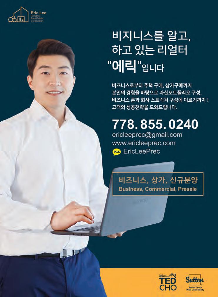2022년 12월 3일 토요일 C11 조선일보 Errors & Omissions - The information contained here in is from the owners of the businesses, therefore no warranties or representations expressed or implied are made to the accuracy and liability of their businesses. 2629 Kingsway, Vancouver B.C. Selmak Realty Ltd. 778-322-7942 이경수 공인중개사 Bond Lee