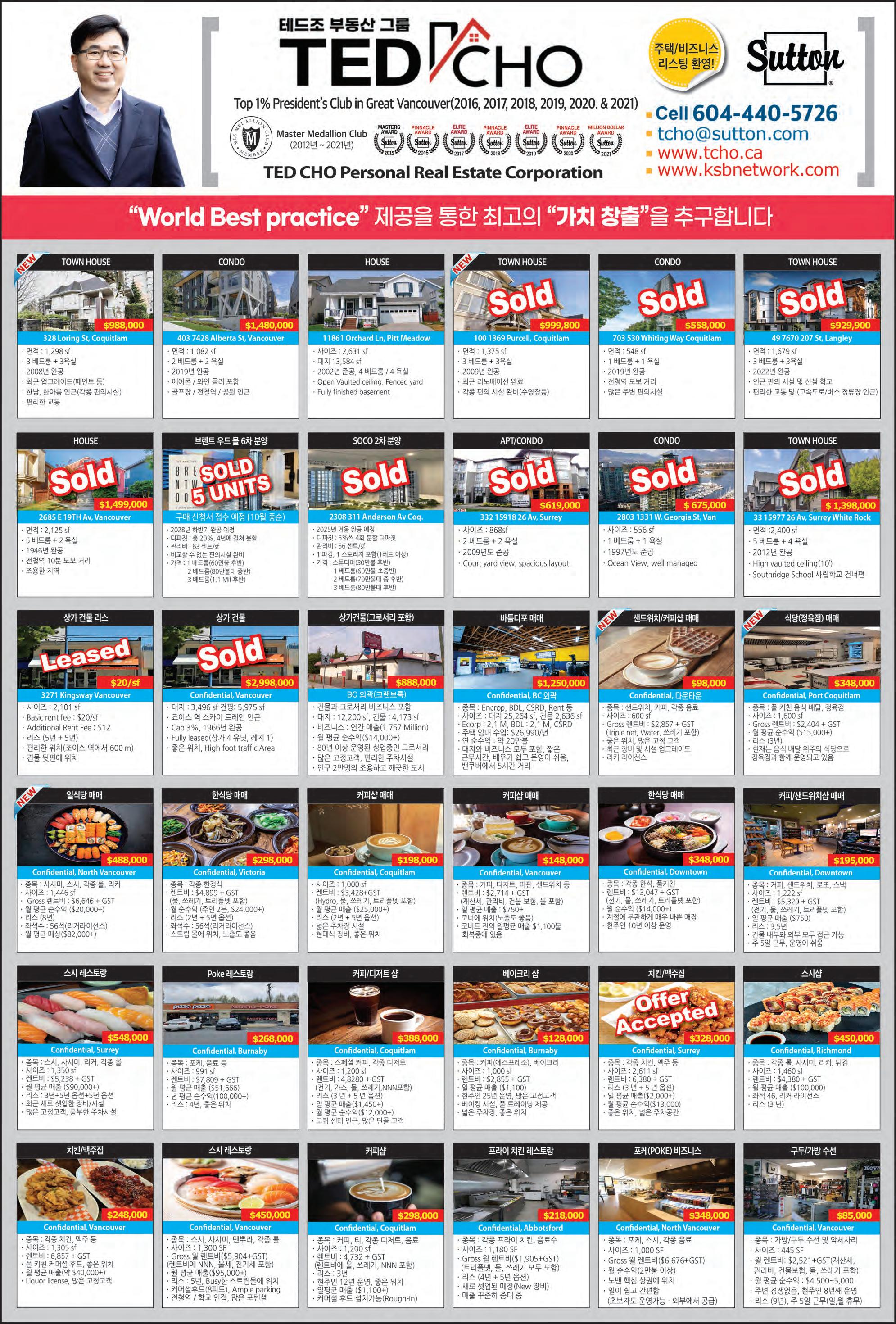 2022년 12월 3일 토요일 C10 조선일보 건축공학 및 건설관리전공 리얼터. 전문성에서 앞서갑니다! #140 4664 Lougheed Hwy Burnaby BC V5C 5T5 TEL: 604-299-9680 Sutton Group 1st West Realty 604.781.3467 rick.royal1st@gmail.com 우종훈 부동산 2015 - 2021 7년 연속 광역밴쿠버 TOP 5% REALTOR 비즈니스 매매 2015 2016 2017 2021 2018 2019 2020 사우스 써리 $2,200,000 대지 면적 6,104 sq.ft 실내면적 4,774 sq.ft 방 6개 화장실 7개 조용한 주택가 남향집 주변 좋은 학군과 공원 브랜트우드 지역 신규 분양중! 어메이징 브랜트우드 5 이 는 Solo 4 이 Concord 오아시스 는 니 가 ★ 로히드 버퀴틀람 지역 ★ ★ 랭리 윌로비 지역 ★ Hayer Town Centre Aston Townhome Master Medallion Member 코퀴틀람 센트럴 $899,900 실내면적 966 sq.ft 방 3대 화장실 2개 골프장 뷰 JUSTSOLD 랭리 윌로비하이츠 $629,000 실내면적 920 sq.ft 방 2개 화장실 2개 5월 입주 예정 전매 물건 파크엔라이드 5분거리 JUSTSOLD 코퀴틀람 센트럴 $789,900 실내면적 863 sq.ft 방 2대 화장실 2개 퓨쳐 공원뷰, 남향 JUSTSOLD 뉴 웨스트민스터 Sold Over Asking $200,000 $899,900 실내면적 1,410 sq.ft 방 3개 화장실 3개 + 덴 모던 디자인, 오픈 컨셉 5분 거리 쇼핑몰 포트 무디 $728,000 실내면적 1,012 sq.ft 방 2개 화장실 2개 + 덴 포트무디 서터브룩 빌리지 각종 편의시설 도보거리 코퀴틀람 센트럴 $3,199,000 대지 면적 6,487 sq.ft 실내 면적 5,575 sq.ft 방 7개 화장실 8개 조용한 주택가 남향집 지하 렌트스윗 뉴웨스트민스터 빅토리아 힐 $539,900 실내면적 663 sq.ft 1 베드 + 1 베스 마스터플랜 커뮤니티 Onni 개발사 랭리 윌로비하이츠 $1,169,000 실내면적 1,766 sq.ft 방 3개 화장실 3개 코너 유닛, 밝은 채광 주변의 편의 시설 및 학교 랭리 월넛그로브 $1,780,000 대지 면적 3,767 sq.ft 실내면적 3,425 sq.ft 방 5개 화장실 4개 조용한 주택가 골프장 뷰 지하 렌트스윗 JUSTSOLD 랭리 월넛그로브 $1,099,000 실내면적 2,229 sq.ft 방 3개 화장실 3개 조용한 주택가 5분거리에 학교, 쇼핑, 공원 JUSTSOLD 랭리 윌로비하이츠 $889,900 실내면적 1,414 sqft 방 3개 화장실 3개 유명건설사 폴리곤 단지내 헬스장, 수영장 각종 편의시설 JUSTSOLD 랭리 윌로비하이츠 라티마 빌리지 $519,900 실내면적 669 sq.ft 1 베드 1베스 JUSTSOLD 써리 센트럴 $489,900 실내면적 517 sq.ft 방 1개 화장실 1개 전철역 및 SFU, 시청 5분 거리 JUSTSOLD JUSTSOLD JUSTSOLD JUSTSOLD 랭리 윌로비하이츠 $779,900 실내면적 1,381 sq.ft 방 3개 화장실 2개 욕슨콘도 전매 7월 입주 예정 JUSTSOLD 랭리 월넛그로브 스시 레스토랑 써리 길포드 빙수가게 $248,900 플라자안에 위치 트래픽이 많음. 매상 꾸준히 증가 OfferAccepted 코퀴틀람 버크마운틴 $2,500,000 대지 면적 5,230 sq.ft 실내 면적 3,314 sq.ft 방 4개 화장실 4개 JUSTSOLD 7년 연속 광역 밴쿠버 TOP 5% REALTOR Master Medallion Member / 604.781.3467 / rick.royal1st@gmail.com